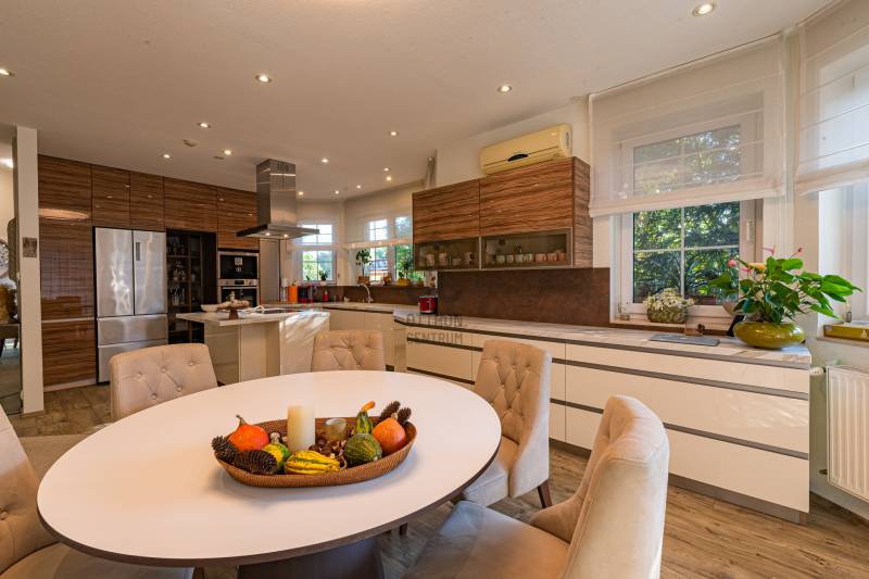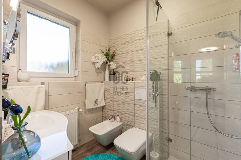 Eladásra kínálunk Pilisvörösvár legkedveltebb, újszerű kertvárosias részén rendkívül csendes de a központhoz még is közeli utcájában,exkluzív, kívül és belül egyaránt elképesztően színvonalas, mintegy 260nm-es újszerű, alapvetően 2005-ban épült de pár éve teljesen felújított, rendkívül nívós megjelenésű és csúcs színvonalú műszaki tartalommal bíró egy szintes családi házat. A ház megépítése során külön hangsúlyt helyeztek az élhető, nagyméretű, világos terek kialakítására, valamint minden helyiségben óriási nyílászárok biztosítják a természetes fényt.Az utcafront irányába helyezkedik el a három állásos garázs ahonnan a házba is be lehet jutni. Hatalmas nappali, részben szeparált konyha és étkező együttes közvetlen fedett és egy másik nyitott teraszkapcsolattal, valamint négy szoba , két fürdőszoba, tárolók, gardrób és kazánhelyiség-mosókonyha beosztású. A fűtés-hűtés hőszivattyús rendszeren keresztül történik, minden helyiségben saját állítási lehetőséggel, az összes nyílászáró korszerű, hőszigetelt műanyag, az árnyékolásukról minden esetben redőny szúnyoghálóval gondoskodik. A tetőre napelemek is felszerelésre kerültek. A hálószobákon kívül mindenhol drága, nagyméretű lapok a padlóburkolatok, az elképesztő méretű fürdőszobában jakuzzi és épített zuhany biztosítja a kényelmet.A mesés, botanikus varázs kertben öntöző és csöpögtető rendszer illetve automata fűnyíró rendszer került kiépítésre, gyepszőnyeggel borított elképesztő örökzöldekkel tarkított. Az egész ingatlan teljesen körbenapozott beleértve a házat is. Nagyon kellemes, exkluzív, nagyvonalú és harmonikus érzés az ingatlanban lenni. Ha kimondottan hangulatos, rendkívüli adottságokkal bíró, csendes de mégis újszerű kertvárosias környezetben keres világos és nagyon színvonalas megjelenésű és kialakítású, csúcs minőségű, modern, újszerű, egy szintes házat lenyűgöző kerttel, akkor bizton állíthatom, hogy megtalálta amit keresett.