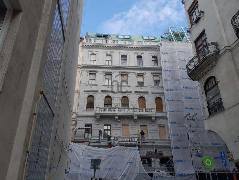 Új építésű lakások Budapest szívébenExkluzív környezetben, műszakilag és esztétikailag a jelen elvárásainak megfelelően megtervezett és kivitelezett 76,445 m2 alapterületű, nappali-konyha-szoba beosztású lakás, 29,65 m2 terasszal eladó.A lakás Petschacher Gusztáv tervei alapján készült épület 5.emeletén helyezkedik el, kétszintes, ablakai a csendes belső udvarra néznek.Kedvező beosztású, az alsó szinten a konyha, nappali és hálószoba, a felső szinten a tetőterasz található. Az előtértől jobbra a 12 m2-es hálószoba, balra a 28 m2-es tágas, világos nappali van, egy légtérben konyha-étkezővel. A fürdő a hálószobából közelíthető meg, a toalett közvetlenül az előtérből nyílik.A lakás hűtéséről és fűtéséről oldalfali fan-coil rendszer gondoskodik. Riasztórendszer kiépítésre kerül. A hidegburkolatok (konyha, fürdőszoba, közlekedők) alatt padlófűtés kerül elhelyezésre. A lakások hűtését és fűtését H tarifás hőszivattyús rendszer biztosítja, így a lakások energiaellátásának költsége nagyon kedvező.A lakásokba a műszaki tartalomban szereplő konyhabútorok és gépek kerülnek beépítésre.A burkolatok és a konyhabútor színe tetszés szerint választható, a kijelölt opciók közül. Megfelelő időben történt megrendelői módosításokra lehetőség van.Projekt leírásA lakások az UNESCO világörökség részét képező műemlék védettség alatt álló épület tejesen új építésű tetőterében helyezkednek el.A lakások legkésőbb 2023 szeptemberétől beköltözhetőek.A lakások mind saját lakásnak, mind értékálló befektetésnek is kiválóak. A már kivitelezés alatt álló 15 lakásos projekt keretében eladásra kínált változatos méretű egyszintes, belső kétszintes, illetve háromszintes luxus lakások nagyméretű tetőterasszal, télikerttel a legmagasabb igényeket kielégítő kivitelben készülnek.ELHELYEZKEDÉS:A lakások elhelyezkedése minden szempontból kedvező, kiváló közlekedési kapcsolatokkal. Közel a Pesti Broadway, pár perc sétára van a Zeneakadémia, az Operaház, az Operettszínház, a világörökség részét képező Andrássy út, a Liszt Ferenc tér, továbbá a Király utca, a Gozsdu udvar, amely a Budapest belvárosának egyik legdinamikusabban fejlődő központja, egy találkozási pont, ami összeköti a szórakozást, a gasztronómiát és a kultúrát. A szórakozó negyed a hét minden napján egyedülállóan izgalmas programokkal várja vendégeit.INGATLANOK:Exkluzív környezetben, műszakilag és esztétikailag a jelen elvárásainak megfelelően megtervezett és kivételezett 64-154 nm alapterületű, teraszos lakások eladók.Az új lakások a luxus minden elemével rendelkeznek, modern otthont teremtve a lakóknak, míg a világörökség részét képező, 1895-96-ban Petschacher Gusztáv tervei alapján épült eklektikus épület őrzi a régi hangulatot, amely az építés során felújított homlokzattal hangsúlyossá válik. Tradicionális környezetben teremt - a luxus minden elemével rendelkező - modern otthonokat.ÜTEMEZÉS:Az építkezés a januárban meghatározott ütemnek megfelelően, késedelem nélkül halad:- a tetőszerkezetet tartó acél keretállások elkészültek, továbbá a műemléki bádog tető fa fogadó részének a felrakása befejeződött, melyet követően az épület teljes lefedése megtörtént.- az udvarra kerülő 8 személyes új Kone lift tartószerkezete kész és 2023 márciusára a lift üzembe helyezése is megtörténik.- a homlokzat felújítás elindult.- a lakások falainak építése, az elektromos és gépészeti munkák is elindultak és megfelelő ütemben folynak.MŰSZAKI TARTALOM:PADLÓBURKOLAT- Beltér -A belső lépcső, kerámia burkolat készül, a megajánlott alap burkolattal. Opcionálisan lehet választani faburkolatot mely megegyezik a svédpadló anyagával.A belső vizes helyiségben, a belső lépcsőkön és a konyhákban, valamint a nappali terében elhelyezkedő konyhai területeken matt kerámia készül.A fürdőszoba egyik falára választható opciós burkolat. A nappali terekben és a hálószobákban svédpadló kerül lefektetésre.- Kültér -A teraszok, és a függőfolyosók csúszásmentes fagyálló kerámia ill. greslap burkolatúak, teljes felületű, üregmentes, flexibilis és fagyálló ragasztással.FALBURKOLAT- BeltérA vizes helyiségben ragasztott kerámia vagy greslap falburkolat készül álmennyezet alsó síkjáig.A pozitív éleket sarokprofillal lesznek kialakítva. A konyhákban a falon csak a konyhabútor és a felső szekrény között készül fali kerámia burkolat.Belső festések min.2 rtg. diszperziós fehér falfesték falakon, mennyezeten- Kültér -A teraszoknál külső Trespa falemezes burkolat kerül a határoló falakra, tölgy színben.NYÍLÁSZÁRÓK- Beltér -Három oldalon falcolt, vázszerkezetű Mantu Echt ajtók kerülnek furnérozott ajtólapokkal, eloxált alumínium kilinccsel és körrozettával.- Kültér -A lakásokhoz tartozó külső nyílászárók rendszere: Gealan S9000 ötkamrás, 3 rétegű, kiváló hang és hőszigetelést biztosító rendszer, kívül barna, belül fehér színű, távirányítóval működő külső redőnnyel. A tetőteraszok tolóajtó szerkezetűek.A tetősíkba beépített ablakok Fakro típusúak, elektromos mozgatású redőnnyel, belül fehér, kívül szürke. Ahol szükséges, betörésbiztos balesetvédelmi biztonsági fóliával ellátott üvegezéssel készül.Az öt ponton záródó, acéltokos lakásbejárati ajtók a hatályos előírásoknak megfelelő biztonsági szinttel, a vonatkozó klímaosztálynak megfelelően készülnek, barna színben.KONYHABÚTORA konyhában beépített süllyesztett led munkafénnyel készül, az ajtók színével azonos színvilágú, 18 mm vastagságú bútorlap kerül beépítésre. A munkalap sz