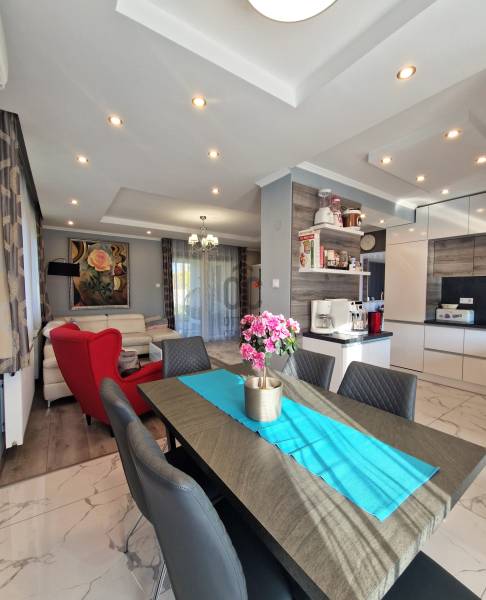 Eladó Erdőkertes Háromház városrészében új építésű házak környezetében egy újszerű, modern, 2020-ban - egyedi tervek alapján, magas műszaki tartalommal, és minőségi anyagokkal - épült, 155 nm-es, földszintes 4 szobás önálló családi ház. Elosztása három normál méretű szobát, beépített szekrénnyel rendelkező előszobát, tágas, a 20 nm-es fedett terasszal kapcsolatos nappalit, gépesített konyhát, étkezőt, háztartási helyiséget, külön wc-t, káddal és zuhanyzóval is rendelkező nagy fürdőszobát és egy dupla állásos, közvetlen előszoba kapcsolatos fűtött, gumi parkolási ütközővel is ellátott garázst foglal magába. A 12 cm-es külső és 20 cm-es mennyezeti szigeteléssel ellátott épületet, telefonnal vezérelhető termosztáttal ellátott Immergas kondenzácíós gázkészülék fűti, radiátoros központi rendszeren keresztül. Az ingatlan esztétikai és műszaki tartalmát gazdagítják egyedi kivitelezési megoldásai, számtalan intelligens extrával - Somfy IO intelligens otthon - is kiegészülve, melyek a teljesség igénye nélkül a következők: Alumínium színezett csatornarendszer, riasztó rendszer mozgásérzékelőkkel és kamerarendszerrel, Honeywell típusú vízszűrő, három rétegű kívülről színes, szúnyoghálóval és alumínium színezett külső párkányokkal is ellátott műanyag nyílászárók, egyedi porta beltéri nyílászárók, AH típusú kívülről színezett biztonsági bejárati ajtó, alumínium színezett redőnyök telefonról vezérelhető motormozgatással, kívülről színezett Rimessa dupla garázskapu mely szintén telefonról vezérelhető, ahogyan a kétszárnyú kertkapu és a 3,5 kw-os Hitachi inverteres split klima is. Az áramellátást 3*16 A biztosítja, 7,5 kw-os napelemrendszer áll rendelkezésre, például a garázsban elhelyezett 3 fázisú Wallbe elektromos autótöltő, és nappaliban található elektromos kandalló üzemeltetésére. A 834 nm-es telek, a több autó beállását is biztosító térkövezett felületen és egy 9 nm-es tárolón túl, parkosított udvarral rendelkezik, melyet robot fűnyíró és wifiről vezérelhető, locsoló almérőre kötött autómata öntözőrendszer segít karban tartani. Az ingatlan tehermentes, jogilag rendezett, várja minőségi és kényelemes otthonra vágyó új lakóit.Ha felkeltettem érdeklődését, várom hívását!