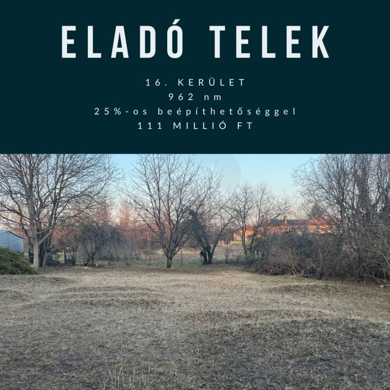 Megvételre kínálunk a 16. kerületben, Cinkotán egy 962 nm-es építési telket, amely ideális választás lehet új otthona megépítéséhez vagy befektetési célokra. A telek egy csendes, kertvárosi környezetben található, ahol a természet közelsége és a városi élet kényelme harmonikusan egyesül.   Ez a lakóövezeti telek nemcsak méretével, hanem elhelyezkedésével is kitűnik. A csendes utcák és a barátságos szomszédság tökéletes hátteret biztosítanak a családi élethez. Az építhető ingatlan típusa: családi ház - 7,5 méter magasságban építhető a homlokozat így Ön szabadon tervezheti meg álmai otthonát.   19,71 m (utca fronti szélesség) x 48,61 m méretekkel rendelkezik a szabályos téglalap alakú telek.Közműveket tekintve: a víz és a gáz a telken belül megtalálható,  a villany és a csatorna az utcában elérhető. Övezeti besorolása: Lke-1/XVI/Sz1Tájolása: dél-nyugatiA környék kiváló közlekedési lehetőségekkel rendelkezik, hiszen a közeli buszmegállók és a HÉV megálló révén Budapest belvárosa könnyen elérhető. Az autós közlekedés is egyszerű, mivel az M0-ás autópálya csupán néhány percre található, így a város többi részére is gyorsan és kényelmesen eljuthat. A környék biztonságos, és a csendes utcák ideálisak a gyerekek számára, akik szabadon játszhatnak a szabadban.  Cinkota nemcsak a zöldövezetekről és a csendes utcákról híres, hanem számos helyi szolgáltatással is rendelkezik. A közelben található iskolák, óvodák és játszóterek mind hozzájárulnak ahhoz, hogy a családok számára ideális környezetet biztosítsanak. Ez a telek tehát nemcsak egy ingatlan, hanem egy lehetőség is, hogy megteremtse családja számára azt az otthont, amelyre mindig is vágyott. Ne habozzon, hiszen az ilyen kivételes ajánlatok gyorsan elkelnek! Kérjük, keressen minket bizalommal, ha bármilyen kérdése van, vagy szeretné megtekinteni ezt a páratlan lehetőséget. Az ingatlanpiac dinamikus, és mi itt vagyunk, hogy Önnek a legjobb döntést segíthessük meghozni.
