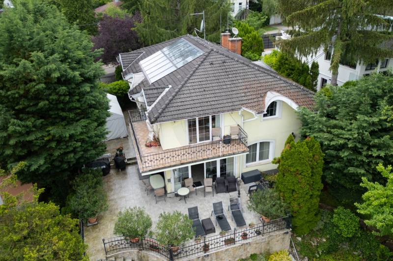 Budaliget egyik legszebb részén, lenyűgöző, örökpanorámás környezetben kínálunk megvételre egy prémium minőségű, 390 m²-es, háromszintes családi házat, 200 m²-es panorámás terasszal, nagy méretű medencével és gyönyörűen gondozott, 1043 m²-es parkosított kerttel.Ez az ingatlan nem csupán otthon – életstílus. Ideális választás többgenerációs családoknak, reprezentatív otthont keresőknek, de akár befektetési céllal is kiváló lehetőség.Főbb jellemzők:- Lakótér: bruttó 390 m², 3 szinten- Terasz: 200 m², panorámás kilátással- Telek: 1043 m², ősfás, parkosított kert- Fűtés: gázkazán, padlófűtés és radiátorok + napkollektoros meleg víz- Építés éve: 1999 – Porotherm 38-as tégla, hőszigetelt- Kilátás: a Kálvária-hegyre, zavartalan örökpanorámaElosztás:- Pinceszint: - Dupla garázs - Konditerem - Wellness helyiség (jacuzzival) - Borospince és tárolók- Földszint: - 72 m²-es nappali kandallóval - Különálló konyha, étkező, kamra - Közvetlen kapcsolat a teraszhoz és a medencéhez- Emelet: - 4 hálószoba (ebből 1 luxus lakosztály saját fürdőszobával és erkéllyel) - További 2 fürdőszoba - GardróbszobaKülső jellemzők:- Nagy méretű, fűthető medence a terasz mellett- Teljes automata öntözőrendszer (2 fúrt kút, 800 méter hosszú csőhálózattal)- Árnyas, zöld kert dísznövényekkel és fákkal- Aszfaltozott utca, kiváló lakókörnyezetEz a villa ritka lehetőség Budaligeten – egy igazi gyöngyszem, ahol a tér, a kényelem, a minőség és a természet közelsége egyszerre jelen van.