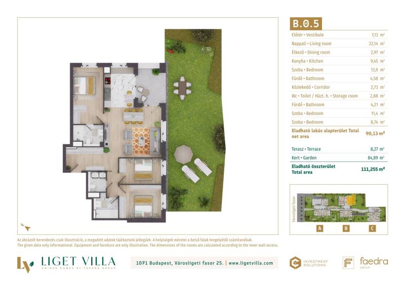 Projekt bemutatásaAki többre vágyik, mint egy átlagos lakópark, most hazaérkezett! Itt élni, itt lakástulajdonosnak lenni, egyet jelent a minőséggel.Az épületrőlA pesti diplomatanegyed legszebb utcájában épül, a megjelenésében, műszaki tartalmában és a lakáskínálata tekintetében egyaránt unikális, Liget Villa Lakópark. Az épületbe érve, egy elegáns lobby és recepcióra érkezünk majd. Innen a három épületet egy kerti úton, passzázs köti majd össze. A tervezés során nagy hangsúlyt kapott a családi igényekre tervezett lakás minőségi használhatósága. Ablakos konyhák, master bedroom-ok, dupla fürdőszobák, gardrób és háztartási helyiségek is helyet kapnak a lakásban. Kiemelten jól bútorzható, két irányba tájolt lakások kerülnek kialakításra. A földszinti lakásokhoz 50-100 m2-es privát kertek, míg a közös területeken tájépítész által tervezett reprezentatív kertet alakítunk ki. A lakásokban mennyezeti hűtés-fűtés biztosítja a téli-nyári kellemes komfortérzetet. A nyílászárók 3 rétegű üveggel, alu-fa kivitelben kerülnek beépítésre. A lakások ára tartalmazza alapárban az alu elektromos redőnyöket és okosotthon kiépítést is. Magas minőségű olasz és spanyol hidegburkolatválasztékban akár 60x60 cm-es lapok is válaszhatóak majd. A fa parketta és az átlag feletti minőség szaniterek, szintén alapárban válaszhatóak a lakásokba. Az épületek alatti mélygarázsban gépkocsibeállók és tárolók kerülnek kialakításra. A környékről:A környék közlekedése kiváló. 5 perc sétával elérhető a Andrássy úton a kisföldalatti. A szomszédos Balzac utcában és Dózsa György úton is számos buszjárat és troli is közlekedik. A város számos pontjára, akár átszállás nélkül is eljuthatunk. Ha pedig autóval közlekedünk, az M3 autópálya pár perc alatt elérhető. A Városligeti fasor két oldalán található szervízúton, parkolnia is lehet a Liget Villa Lakóparkba érkezőknek.Előnyök:A Liget Villa Lakpark lakásai, tökéletes választás azoknak, akik szeretnék élvezni a városi kényelmet anélkül, hogy lemondanának a természet közelségéről és a csendes életformáról. A belváros és a zöld liget is sétatávolságban elérhető. A gyerekek számára paradicsom a Városliget. Játszóterek, tó, sportpályák, állatkert, minden, amit egy gyerek csak kívánhat egy parkban. A közelben pedig a kultúrát és a sportos életformát kedvelők, egyaránt megtalálják a számukra fontos helyszíneket. Néprajzi, Szépművészeti, Mezőgazdasági múzeumok, a Magyar Zene Háza, a Műcsarnok mind-mind gazdag élményt nyújtanak az oda látogatóknak. A Városliget fasor pedig már önmagában egy oázis a városi környezetben. Hatalmas gesztenyefák, gyönyörű villaépületek, követségek, gimnázium, templom mellett sétálhatunk el nap mint nap. Ide nagyon jó lesz minden nap hazajönni.
