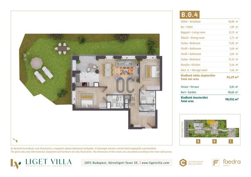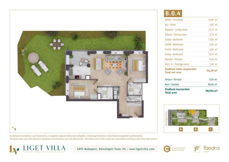 Projekt bemutatásaAki többre vágyik, mint egy átlagos lakópark, most hazaérkezett! Itt élni, itt lakástulajdonosnak lenni, egyet jelent a minőséggel.Az épületrőlA pesti diplomatanegyed legszebb utcájában épül, a megjelenésében, műszaki tartalmában és a lakáskínálata tekintetében egyaránt unikális, Liget Villa Lakópark. Az épületbe érve, egy elegáns lobby és recepcióra érkezünk majd. Innen a három épületet egy kerti úton, passzázs köti majd össze. A tervezés során nagy hangsúlyt kapott a családi igényekre tervezett lakás minőségi használhatósága. Ablakos konyhák, master bedroom-ok, dupla fürdőszobák, gardrób és háztartási helyiségek is helyet kapnak a lakásban. Kiemelten jól bútorzható, két irányba tájolt lakások kerülnek kialakításra. A földszinti lakásokhoz 50-100 m2-es privát kertek, míg a közös területeken tájépítész által tervezett reprezentatív kertet alakítunk ki. A lakásokban mennyezeti hűtés-fűtés biztosítja a téli-nyári kellemes komfortérzetet. A nyílászárók 3 rétegű üveggel, alu-fa kivitelben kerülnek beépítésre. A lakások ára tartalmazza alapárban az alu elektromos redőnyöket és okosotthon kiépítést is. Magas minőségű olasz és spanyol hidegburkolatválasztékban akár 60x60 cm-es lapok is válaszhatóak majd. A fa parketta és az átlag feletti minőség szaniterek, szintén alapárban válaszhatóak a lakásokba. Az épületek alatti mélygarázsban gépkocsibeállók és tárolók kerülnek kialakításra. A környékről:A környék közlekedése kiváló. 5 perc sétával elérhető a Andrássy úton a kisföldalatti. A szomszédos Balzac utcában és Dózsa György úton is számos buszjárat és troli is közlekedik. A város számos pontjára, akár átszállás nélkül is eljuthatunk. Ha pedig autóval közlekedünk, az M3 autópálya pár perc alatt elérhető. A Városligeti fasor két oldalán található szervízúton, parkolnia is lehet a Liget Villa Lakóparkba érkezőknek.Előnyök:A Liget Villa Lakpark lakásai, tökéletes választás azoknak, akik szeretnék élvezni a városi kényelmet anélkül, hogy lemondanának a természet közelségéről és a csendes életformáról. A belváros és a zöld liget is sétatávolságban elérhető. A gyerekek számára paradicsom a Városliget. Játszóterek, tó, sportpályák, állatkert, minden, amit egy gyerek csak kívánhat egy parkban. A közelben pedig a kultúrát és a sportos életformát kedvelők, egyaránt megtalálják a számukra fontos helyszíneket. Néprajzi, Szépművészeti, Mezőgazdasági múzeumok, a Magyar Zene Háza, a Műcsarnok mind-mind gazdag élményt nyújtanak az oda látogatóknak. A Városliget fasor pedig már önmagában egy oázis a városi környezetben. Hatalmas gesztenyefák, gyönyörű villaépületek, követségek, gimnázium, templom mellett sétálhatunk el nap mint nap. Ide nagyon jó lesz minden nap hazajönni.