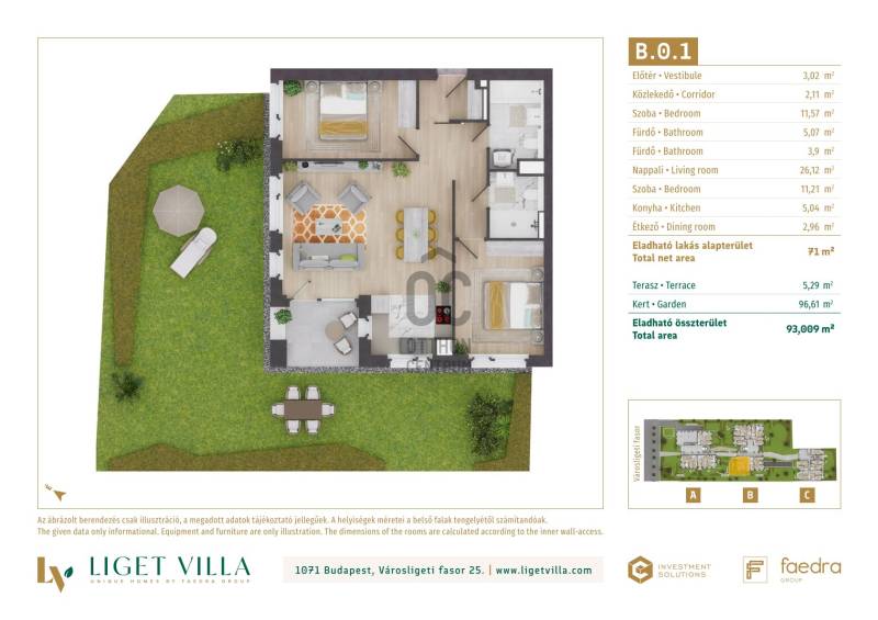 Projekt bemutatásaAki többre vágyik, mint egy átlagos lakópark, most hazaérkezett! Itt élni, itt lakástulajdonosnak lenni, egyet jelent a minőséggel.Az épületrőlA pesti diplomatanegyed legszebb utcájában épül, a megjelenésében, műszaki tartalmában és a lakáskínálata tekintetében egyaránt unikális, Liget Villa Lakópark. Az épületbe érve, egy elegáns lobby és recepcióra érkezünk majd. Innen a három épületet egy kerti úton, passzázs köti majd össze. A tervezés során nagy hangsúlyt kapott a családi igényekre tervezett lakás minőségi használhatósága. Ablakos konyhák, master bedroom-ok, dupla fürdőszobák, gardrób és háztartási helyiségek is helyet kapnak a lakásban. Kiemelten jól bútorzható, két irányba tájolt lakások kerülnek kialakításra. A földszinti lakásokhoz 50-100 m2-es privát kertek, míg a közös területeken tájépítész által tervezett reprezentatív kertet alakítunk ki. A lakásokban mennyezeti hűtés-fűtés biztosítja a téli-nyári kellemes komfortérzetet. A nyílászárók 3 rétegű üveggel, alu-fa kivitelben kerülnek beépítésre. A lakások ára tartalmazza alapárban az alu elektromos redőnyöket és okosotthon kiépítést is. Magas minőségű olasz és spanyol hidegburkolatválasztékban akár 60x60 cm-es lapok is válaszhatóak majd. A fa parketta és az átlag feletti minőség szaniterek, szintén alapárban válaszhatóak a lakásokba. Az épületek alatti mélygarázsban gépkocsibeállók és tárolók kerülnek kialakításra. A környékről:A környék közlekedése kiváló. 5 perc sétával elérhető a Andrássy úton a kisföldalatti. A szomszédos Balzac utcában és Dózsa György úton is számos buszjárat és troli is közlekedik. A város számos pontjára, akár átszállás nélkül is eljuthatunk. Ha pedig autóval közlekedünk, az M3 autópálya pár perc alatt elérhető. A Városligeti fasor két oldalán található szervízúton, parkolnia is lehet a Liget Villa Lakóparkba érkezőknek.Előnyök:A Liget Villa Lakpark lakásai, tökéletes választás azoknak, akik szeretnék élvezni a városi kényelmet anélkül, hogy lemondanának a természet közelségéről és a csendes életformáról. A belváros és a zöld liget is sétatávolságban elérhető. A gyerekek számára paradicsom a Városliget. Játszóterek, tó, sportpályák, állatkert, minden, amit egy gyerek csak kívánhat egy parkban. A közelben pedig a kultúrát és a sportos életformát kedvelők, egyaránt megtalálják a számukra fontos helyszíneket. Néprajzi, Szépművészeti, Mezőgazdasági múzeumok, a Magyar Zene Háza, a Műcsarnok mind-mind gazdag élményt nyújtanak az oda látogatóknak. A Városliget fasor pedig már önmagában egy oázis a városi környezetben. Hatalmas gesztenyefák, gyönyörű villaépületek, követségek, gimnázium, templom mellett sétálhatunk el nap mint nap. Ide nagyon jó lesz minden nap hazajönni.