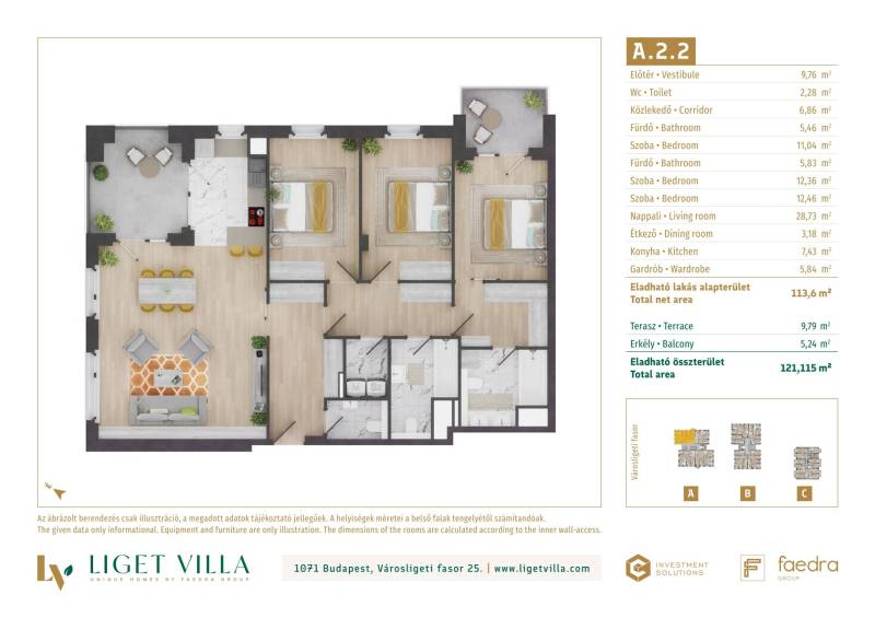 Projekt bemutatásaAki többre vágyik, mint egy átlagos lakópark, most hazaérkezett! Itt élni, itt lakástulajdonosnak lenni, egyet jelent a minőséggel.Az épületrőlA pesti diplomatanegyed legszebb utcájában épül, a megjelenésében, műszaki tartalmában és a lakáskínálata tekintetében egyaránt unikális, Liget Villa Lakópark. Az épületbe érve, egy elegáns lobby és recepcióra érkezünk majd. Innen a három épületet egy kerti úton, passzázs köti majd össze. A tervezés során nagy hangsúlyt kapott a családi igényekre tervezett lakás minőségi használhatósága. Ablakos konyhák, master bedroom-ok, dupla fürdőszobák, gardrób és háztartási helyiségek is helyet kapnak a lakásban. Kiemelten jól bútorzható, két irányba tájolt lakások kerülnek kialakításra. A földszinti lakásokhoz 50-100 m2-es privát kertek, míg a közös területeken tájépítész által tervezett reprezentatív kertet alakítunk ki. A lakásokban mennyezeti hűtés-fűtés biztosítja a téli-nyári kellemes komfortérzetet. A nyílászárók 3 rétegű üveggel, alu-fa kivitelben kerülnek beépítésre. A lakások ára tartalmazza alapárban az alu elektromos redőnyöket és okosotthon kiépítést is. Magas minőségű olasz és spanyol hidegburkolatválasztékban akár 60x60 cm-es lapok is válaszhatóak majd. A fa parketta és az átlag feletti minőség szaniterek, szintén alapárban válaszhatóak a lakásokba. Az épületek alatti mélygarázsban gépkocsibeállók és tárolók kerülnek kialakításra. A környékről:A környék közlekedése kiváló. 5 perc sétával elérhető a Andrássy úton a kisföldalatti. A szomszédos Balzac utcában és Dózsa György úton is számos buszjárat és troli is közlekedik. A város számos pontjára, akár átszállás nélkül is eljuthatunk. Ha pedig autóval közlekedünk, az M3 autópálya pár perc alatt elérhető. A Városligeti fasor két oldalán található szervízúton, parkolnia is lehet a Liget Villa Lakóparkba érkezőknek.Előnyök:A Liget Villa Lakpark lakásai, tökéletes választás azoknak, akik szeretnék élvezni a városi kényelmet anélkül, hogy lemondanának a természet közelségéről és a csendes életformáról. A belváros és a zöld liget is sétatávolságban elérhető. A gyerekek számára paradicsom a Városliget. Játszóterek, tó, sportpályák, állatkert, minden, amit egy gyerek csak kívánhat egy parkban. A közelben pedig a kultúrát és a sportos életformát kedvelők, egyaránt megtalálják a számukra fontos helyszíneket. Néprajzi, Szépművészeti, Mezőgazdasági múzeumok, a Magyar Zene Háza, a Műcsarnok mind-mind gazdag élményt nyújtanak az oda látogatóknak. A Városliget fasor pedig már önmagában egy oázis a városi környezetben. Hatalmas gesztenyefák, gyönyörű villaépületek, követségek, gimnázium, templom mellett sétálhatunk el nap mint nap. Ide nagyon jó lesz minden nap hazajönni.