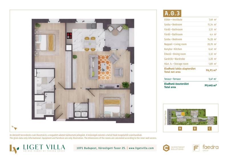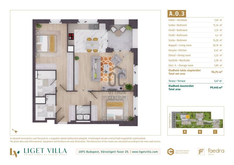 Projekt bemutatásaAki többre vágyik, mint egy átlagos lakópark, most hazaérkezett! Itt élni, itt lakástulajdonosnak lenni, egyet jelent a minőséggel.Az épületrőlA pesti diplomatanegyed legszebb utcájában épül, a megjelenésében, műszaki tartalmában és a lakáskínálata tekintetében egyaránt unikális, Liget Villa Lakópark. Az épületbe érve, egy elegáns lobby és recepcióra érkezünk majd. Innen a három épületet egy kerti úton, passzázs köti majd össze. A tervezés során nagy hangsúlyt kapott a családi igényekre tervezett lakás minőségi használhatósága. Ablakos konyhák, master bedroom-ok, dupla fürdőszobák, gardrób és háztartási helyiségek is helyet kapnak a lakásban. Kiemelten jól bútorzható, két irányba tájolt lakások kerülnek kialakításra. A földszinti lakásokhoz 50-100 m2-es privát kertek, míg a közös területeken tájépítész által tervezett reprezentatív kertet alakítunk ki. A lakásokban mennyezeti hűtés-fűtés biztosítja a téli-nyári kellemes komfortérzetet. A nyílászárók 3 rétegű üveggel, alu-fa kivitelben kerülnek beépítésre. A lakások ára tartalmazza alapárban az alu elektromos redőnyöket és okosotthon kiépítést is. Magas minőségű olasz és spanyol hidegburkolatválasztékban akár 60x60 cm-es lapok is válaszhatóak majd. A fa parketta és az átlag feletti minőség szaniterek, szintén alapárban válaszhatóak a lakásokba. Az épületek alatti mélygarázsban gépkocsibeállók és tárolók kerülnek kialakításra. A környékről:A környék közlekedése kiváló. 5 perc sétával elérhető a Andrássy úton a kisföldalatti. A szomszédos Balzac utcában és Dózsa György úton is számos buszjárat és troli is közlekedik. A város számos pontjára, akár átszállás nélkül is eljuthatunk. Ha pedig autóval közlekedünk, az M3 autópálya pár perc alatt elérhető. A Városligeti fasor két oldalán található szervízúton, parkolnia is lehet a Liget Villa Lakóparkba érkezőknek.Előnyök:A Liget Villa Lakpark lakásai, tökéletes választás azoknak, akik szeretnék élvezni a városi kényelmet anélkül, hogy lemondanának a természet közelségéről és a csendes életformáról. A belváros és a zöld liget is sétatávolságban elérhető. A gyerekek számára paradicsom a Városliget. Játszóterek, tó, sportpályák, állatkert, minden, amit egy gyerek csak kívánhat egy parkban. A közelben pedig a kultúrát és a sportos életformát kedvelők, egyaránt megtalálják a számukra fontos helyszíneket. Néprajzi, Szépművészeti, Mezőgazdasági múzeumok, a Magyar Zene Háza, a Műcsarnok mind-mind gazdag élményt nyújtanak az oda látogatóknak. A Városliget fasor pedig már önmagában egy oázis a városi környezetben. Hatalmas gesztenyefák, gyönyörű villaépületek, követségek, gimnázium, templom mellett sétálhatunk el nap mint nap. Ide nagyon jó lesz minden nap hazajönni.