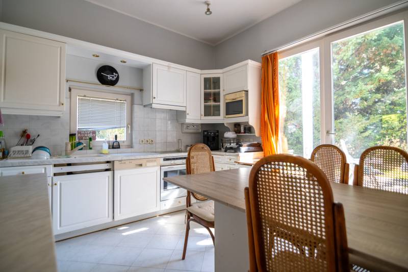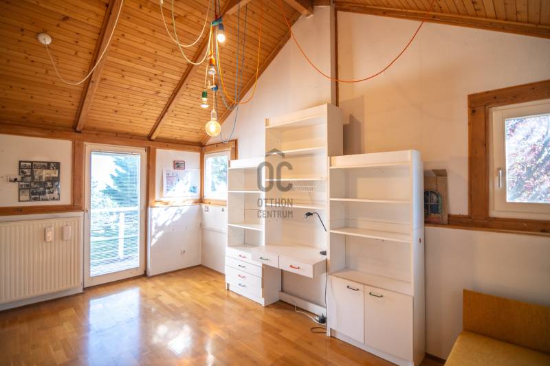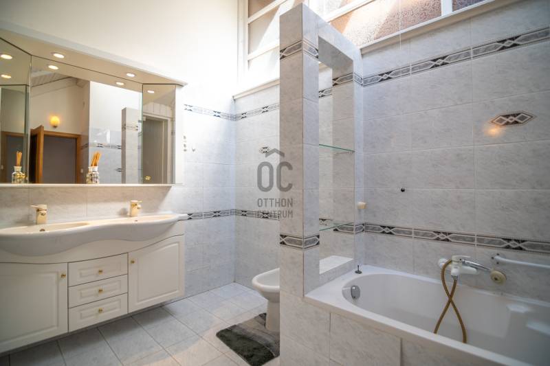 Budafokon, a XI. és a XXII. kerület határán, egy 236 nm lakóterületű, alápincézett, belső két szintes, remek adottságú, korának megfelelő állapotú családi ház eladó dupla garázzsal és intim kerttel.Környék:Budafok XI. kerülettel határos, lankás területén, csendes, kertvárosias, családi házakkal beépített részen járunk.Közlekedés:150B, 251, 251A, 251E buszok megállója fél percnyi sétával elérhető.Kert:Az utca felől a kíváncsi tekintetektől védett, dísznövényekkel, termő gyümölcsfákkal és virágokkal tarkított, gondozott terület övezi az építményt.A kert alatt zöld-tetős, 2 állásos garázs épültÉpület:Az 1993-ban épült, betonfödémes házat Vadász György, Kossuth díjas építész tervezte, egyedi belsőépítészeti megoldások jellemzik.Sajátos térformálási és burkolati megoldások, faberakások és az ablakok formai megoldása különleges hangulatot sugároznak. A nyílászárók fa, kétrétegű üvegezésű, hőszigetelt ablakok, redőnnyel.Földszintjén tágas nappali kandallóval, kilátással az óriási teraszra és a kertre, nagy hálószoba, konyha-étkező, kamra és tusoló-wc kapott helyet.Pinceszintjén, melyet a konyhából közelíthetünk meg, zuhanyzó, vízkezelő, finn szauna, kamra, kazán és mosókonyha van.Az emeletről a Szécsényi-hegytől a Citadelláig nyíló panorámát csodálhatjuk. Itt egy előtérből 3 nagy belmagasságú, külön bejáratú szoba és egy fürdőszoba közelíthető meg a galériáról.