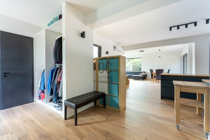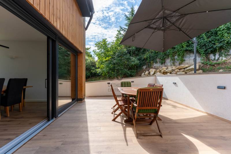 Emellett a ház mellett nem lehet szó nélkül elmenni. A környéken lakók és erre járók előszeretettel csodálják meg. Az erdő mellett, környezetéhez tökéletesen illő, természetes anyagokból épült, modern, kilátással rendelkező ház. Nem túl nagy, pont jó méretű és ideális elrendezésű egy nagyobb létszámú család számára is. Az ideális családi fészek. Üdv itthon!RÖVID ÖSSZEFOGLALÓBudapest III. kerületének Testvérhegy részén, az erdő mellett, az Ér utcában, egy 2022-ben épült, 574 m²-es telken, háromszintes családi ház, dupla állásos garázzsal. A 241 m² alapterületű otthon tágas 53 m²-es amerikai konyhás közösségi térrel, 5 hálószobával, 2 fürdőszobával és külön mellékhelyiséggel rendelkezik. A 26 m²-es terasz, az opcionálisan építhető kültéri medence és a fedett pihenőrész tökéletes kikapcsolódást nyújt, míg a ház skandináv stílusú faburkolata természetes eleganciát sugároz.Ér utca 2Csendes, alacsony forgalmú mellékutcában található, mely párhuzamos a Jablonka úttal. A cél egy kívülről is mutatós, mégis visszafogott, környezetébe illő épületet megalkotása volt. Ennek sikerét bizonyítja, hogy gyakran állnak meg az erre járó-kelők és csodálják meg a ház egyedi sziluettjét.Alapvetően egy modern, tégla építésű, szigeteléssel rendelkező házról beszélünk, melyet skandináv ihletés alapján fa burkolattal láttak el. Ettől légiesebb, természet közelibb a megjelenése. A három rétegű fém ablakok különleges hangulatot biztosítanak, mintha egy képen keresztül tekintenénk a világra. A felső szint részben tetőtéri, de a magas parapet magasság, illetve tetőtéri ablakok ezt megtörik, így a szobák jól használhatóak.A fűtés gázzal, a hő leadás a nappali szinten padlófűtéssel, az emeleten a hálószobákban radiátorokkal és szintén padlófűtéssel történik. A klimatizálás klímával, minden szobában külön egységgel.A tervek szerint a kertben medence is kialakításra került volna, de ez végül nem valósult meg. Igény szerint kialakítható. A nyári hőségben a nagy méretű terasz vagy az egyik fa árnyéka biztosít majd menedéket. Ez lesz a kedvelt helyszín a családi és baráti összejövetelekre.PINCESZINT - 88 m² Autóinkkal automata kapuval rendelkező, tágas, 66 m²-es 2 állásos garázsunkban parkolhatunk. Innen közvetlenül juthatunk fel a felsőbb emeletekre.A háztartási helyiség egyben van a kazánházzal, a gépek így nem a lakótérben zajonganak. Ablakos, a szellőzés tehát megoldott.Van még egy nagy tároló, ahol rengeteg minden elfér. Sportoláshoz használatos tárgyakat és eszközöket, téli gumikat, vizet, tartós ételt stb. attól függően, mire van szükségünk a mindennapokban.FÖLDSZINT - 89 m²Tágas előtérbe érkezünk, ahol kényelmesen meg tudunk érkezni és van elég hely holmijaink lepakolásához. Azonnal szembetűnik a világos, hatalmas terű, nyitott érzésű nappali, ami befelé hívogat. Ezt a hangulatot nem sikerült igazán jól visszaadnunk a képeken, érdemes személyesen megtapasztalnia. Az asztalos által egyedileg készített konyhaszigetes konyha a ház lelke. Minden reggel és este itt gyűlik össze a család. A háziasszonyok kedvelni fogják a sok tárolási lehetőséget, valamint a kis szeparáltságot, ami mégsem választja el őket a közösségtől. A nappaliból kilátás nyílik a városra. A kerület \"ikonikus\" tornya tökéletes látható. Tolóajtón keresztül juthatunk ki teraszunkra. A kint és a bent szinte eggyé válik.Ezen a szinten kialakításra került egy szoba, ami jelenleg dolgozónak van kialakítva, de hálószobának, vendégszobának is tökéletes. Mellette körbejárható fürdő, wc-vel, ami teljes értékűvé teszi.EMELET - 85 m²A jól átgondolt alaprajz élhető tereket és elrendezést tett lehetővé. Tökéletes három, akár négy gyerekesek számára is. Minden szoba külön nyílik. Dupla komfort teszi egyszerűbbé a hétköznapokat. Minden háló más jellegű kilátással rendelkezik, valamelyikből gyönyörű panoráma nyílik a Pilisi hegyekre, másokból, pedig zöldre.KINEK AJÁNLOMIdeális választás nagyobb családoknak, akik értékelik a modern dizájnt és a természet közelségét. Azoknak ajánlom, akik nyugodt, csendes környéken keresnek, új építésű otthont, mely nem túl nagy, könnyen karban tartható, kompromisszum mentes, minden igényt kielégít.TESTVÉRHEGYAz Ér utca 2 a III. kerület csendes, zöldövezeti részén, Testvérhegyen található, mely jelenleg az egyik legkedveltebb és legmegfizethetőbb, a belvároshoz közel eső zöldövezeti rész Budán. A környék legfőbb tudnivalói:- kiváló túrázási lehetőségek a természet kedvelőinek- elsősorban autós megközelítés, tömegközlekedés busszal- legközelebbi bevásárló központ - Eurocenter- infrastrukturálisan jól ellátott - Tesco, Lidl, benzinkutak, éttermek, beauty szalon, fodrászat, bank stb.- egészségügyi problémával a Szent Margit kórházba érdemes menni- számos sportolási lehetőség a közelben pl.: tenisz, foci, kosárlabda stb.- kikapcsolódás - Hármashatár-hegy- Buda belvárosi része könnyen és gyorsan megközelíthető gépjárművelItt minden eltöltött nap maga a feltöltődés. Friss levegő, zöld környezet és a hegyek még szíved épségére is ügyelnek.------Az életérzés, amit ez az ingatlan magából áraszt páratlan, melyet rendkívül nehéz átadni, meg kell tapasztalni. Ha ide belépsz, garantáltan nem akarsz elmenni. Szeretettel várunk egy bejárásra, hogy az élményt személyesen is átélhesd!