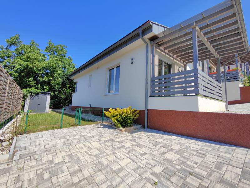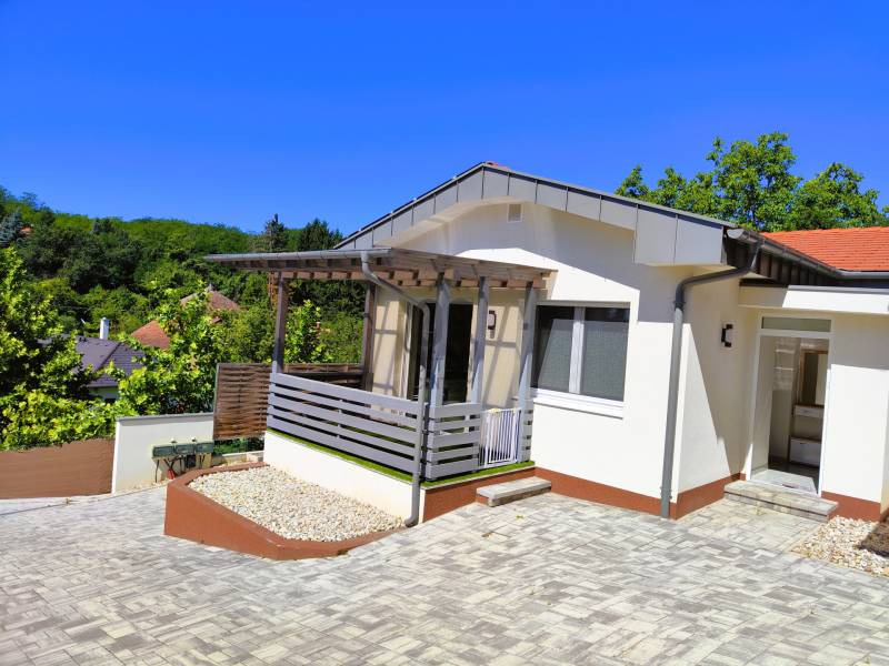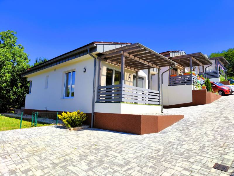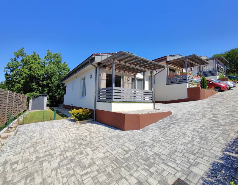 A sorház első háznak lehet boldog tulajdonosa!Ízlésesen kialakított azonnal költözhető!Hévíz zöldövezeti csendes részén található ez a dombos délkeleti fekvésű panorámás telek, ezen épült a három, 75 m2 hasznos alapterületű, egyszintes lakóépület. A hozzá tartozó udvarrészben kerti tároló is helyet kapott.Az ingatlanban található: előszoba, nappali – étkező – konyha, háztartási helyiség, zuhanyzó/WC, közlekedő, 3 db hálószoba, fürdőkádas fürdőszoba WC-vel.A nagy nappalihoz kertkapcsolatos épített terasz tartozik, zöld területtel, automata locsolórendszerrel.A kültéri 2 db gépkocsi beálló viacolor burkolattal készült.Műanyag nyílászárók modern, 3 rétegű üvegezéssel, elektromos redőnyökkel, szúnyoghálókkal felszereltek.A homlokzat 20 cm vastag, EPS hőszigetelő rendszert kapott.Minden helyiségben hőszivattyús hűtés-fűtés rendszer került kialakításra, külön hőfokszabályzással, 6 KW-os napelem rendszert is kapott az ingatlan szaldós elszámolással.A hűtést illetve a fűtést minden helyiségben bárhonnan külön telefonról lehet irányítani, úgyszintén a napelemes rendszert is!Kerámia burkolattal ellátott helyiségeknél padlófűtés növeli a komfortérzetet.Héjvédelmi riasztással ellátva.A modern építészeti megoldásoknak és a napelemnek köszönhetően, nagyon alacsony a fenntartási költsėg!Hívjon, hogy az öné lehessen!