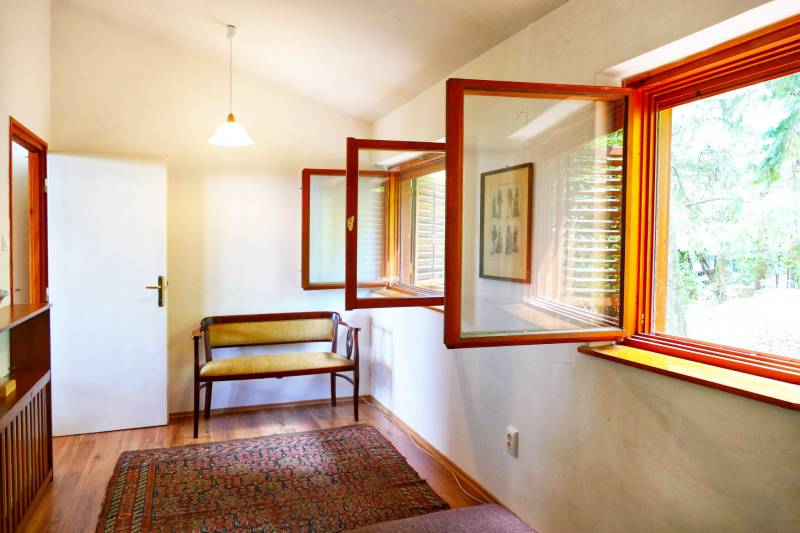 Szentendre, Boldogtanya belterületén, téliesített hétvégi ház eladó!TELEK:- 959 nm- panorámás- csendes környék- aszfalt úton megközelíthető- bekerített minden oldalról- autóbeálló , díszkő burkolatú- rendezett, ápolt kert- előkertben fenyőfák adják az árnyékot a kövezett terasz részre- a telek hátsó oldala enyhén lejtős,- oldalkert részben örökzöldek, gyümölcsfák ( cseresznye, mogyoró és szilva) , cserjék, évelő virágok- kert jelentős része füvesítettHÉTVÉGI HÁZ : - 1970-es években épült- tégla építésű- 2006-ban teljes körű felújítást végeztek a tulajdonosok.- a ház megkímélt, újszerű állapotban van- két különálló részből áll- a lakótér két szoba, nappali, konyha, fürdőszobából áll- 55 nm- belmagassága 280 cm-beépített bútor az előszobában- a nappaliból és az egyik hálószobából csodálatos panorámában lehet részünk.- Nappaliból egy 11,5 nm fedett erkélyre juthatunk ki.-parketta burkolat , fürdőszobában , konyhában, előszobában járólap- gáz cirkó fűtés, radiátorral- télen temperálva van a hőmérséklet- nyílászárók fából- nagy ablakokon a nappaliban redőny, a kisebb ablakokon zsalugáter- kert kapcsolatos szint 35 nm két részből áll, az egyik rész 16 nm, ebből kb 5 nm zuhany kabinos fürdőszoba, valamint egy sport szoba ( 11 nm) oldalfal hosszúságban beépített szekrényekkel a másik rész ( 20nm) is két helyiségből áll, egy konyha- étkezővel, és egy nagy tároló, beépített bútorokkal, szekrényekkel- terasz és kert kapcsolat - a ház teljes bútorzattal eladó ( néhány személyes tárgy kivételével) - Keleti fekvésű