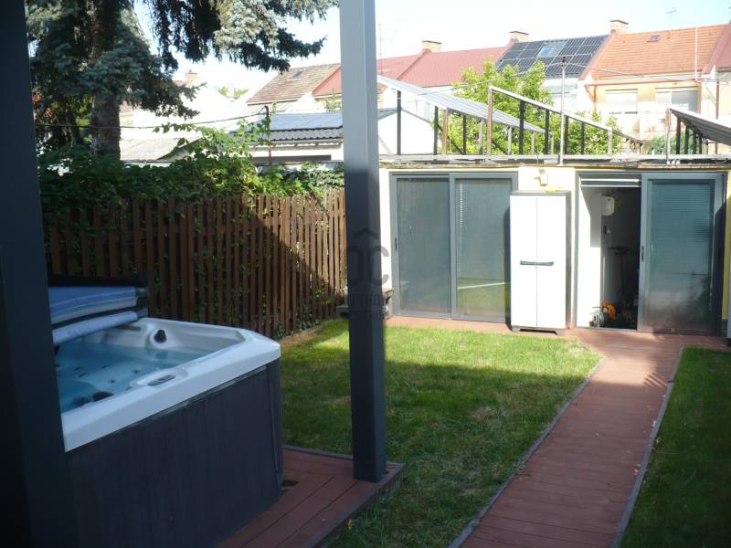 Debrecen frekventált övezetében kínálunk egy különleges lehetőséget!A Malompark közelében eladó egy modern, kiváló minőségben felújítottönálló családi ház, zárt sorú beépítéssel.Nappali+ 2 hálószoba, a hozzá tartozó 195 nm -es telekkel, 2 fűtött garázzsal.Az épület felújítása során :- az épület külső szigetelést kapott- színezett műanyag ablakok és ajtók kerültek beépítésre, elektromos alu redőnyökkel szerelve- az épület fűtése és hűtése hőszivattyúval történik- nagy méretű terasz, erkély, - 3 db pergola, amely kb. 40 nm-es- minőségi konyhabútor, beépített gépekkel- a fürdőszobában masszázskád, a kertben jakuzziAz épület energiaellátását a felszerelt SALDO elszámolású 10 KW teljesítményű napelem biztosítja,így a fenntartási költsége minimális.Az ingatlan minden beépített részletében kiváló minőségű!Tehermentes, rövid határidővel birtokba vehető!