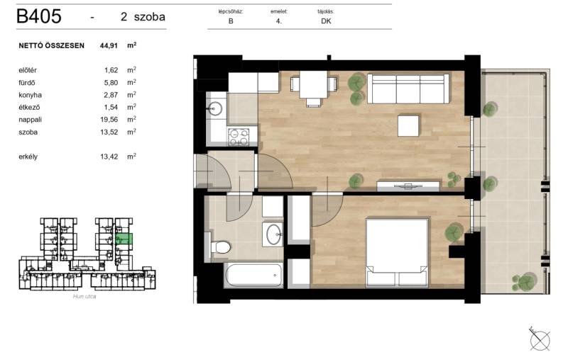Minőségi, új építésű lakás, októberi átadással!Budapest XIII. kerületében a Hun utcában, új építésű társasházban eladásra kínálok negyedik emeleti, 45 nm-es lakást, 13 nm-es erkéllyel.A lakáshoz teremgarázs hely vásárolható 6.99MFt-ért.A kivitelező több mint 15 éve jelen van a piacon, és több mint 2.500 lakás kivitelezésében vett részt. Kiváló közlekedéssel, a belvárostól mindössze öt percre található.Bevásárlási és rekreációs lehetőségek a közelbenKiváló tömegközlekedésGazdaságos, fenntartható otthonokLegmodernebb hőszivattyús mennyezeti hűtés fűtés, alacsony rezsi!Egyedülálló belső zöld környezetVilágos életterekHangulatos belső térA Róbert Károly körút melletti beruházással elegáns, élhető otthonokat terveztek, fiataloknak, időseknek valamint akiknek fontos a városias de mégis zöld környezet.Részletekért, további információkért várom megtisztelő hívását! B405
