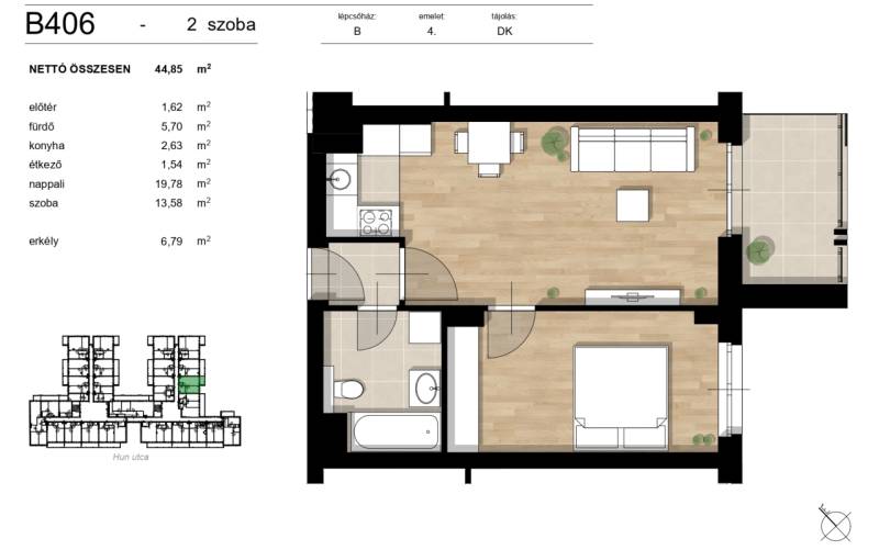 Minőségi, új építésű lakás, októberi átadással!Budapest XIII. kerületében a Hun utcában, új építésű társasházban eladásra kínálok negyedik emeleti, 45 nm-es lakást, 7 nm-es erkéllyel.A lakáshoz teremgarázs hely vásárolható 6.99MFt-ért.A kivitelező több mint 15 éve jelen van a piacon, és több mint 2.500 lakás kivitelezésében vett részt. Kiváló közlekedéssel, a belvárostól mindössze öt percre található.Bevásárlási és rekreációs lehetőségek a közelbenKiváló tömegközlekedésGazdaságos, fenntartható otthonokLegmodernebb hőszivattyús mennyezeti hűtés fűtés, alacsony rezsi!Egyedülálló belső zöld környezetVilágos életterekHangulatos belső térA Róbert Károly körút melletti beruházással elegáns, élhető otthonokat terveztek, fiataloknak, időseknek valamint akiknek fontos a városias de mégis zöld környezet.Részletekért, további információkért várom megtisztelő hívását! B406