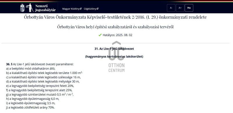 ŐRBOTTYÁN HAMAROSAN MEGÉPÜLŐ ÚJ VÁROSKÖZPONTJÁNAK KÖZELÉBEN, NAGY ÉRTÉKŰ CSALÁDI HÁZAKKAL / IKERHÁZAKKAL FOLYAMATOSAN BEÉPÜLŐ, CSENDES, NYUGODT ÉS ÁTMENŐ FORGALOMTÓL MENTES, ASZFALTOZOTT (ZSÁK)UTCÁJÁBAN, LKE-1-ES JELÖLÉSŰ (HAGYOMÁNYOS KERTVÁROSIAS LAKÓTERÜLET) ÉPÍTÉSI ÖVEZETBE TARTOZÓ, BELTERÜLETI, 1000 M2 ALAPTERÜLETŰ, DÉLNYUGATI TÁJOLÁSÚ, ÖSSZKÖZMŰVES (A TELKEN BELÜL VILLANY-, GÁZ-, VEZETÉKES VÍZ ÉS CSATORNA BEKÖTÉSSEL IS MÁR RENDELKEZŐ(!!!), CSALÁDI HÁZ VAGY IKERHÁZ ÉPÍTÉSÉRE IS KIVÁLÓAN ALKALMAS, ÖRÖK PANORÁMÁS, ENYHÉN LEJTŐS ÉPÍTÉSI TELEK ELADÓ !!!Az eladó telek főbb paraméterei:A telek építési övezet besorolása: Lke-1 (Hagyományos kertvárosias lakóterület)A telek beépítési módja: Oldalhatáron álló beépítési módA telek pozíciója: közbenső (nem saroktelek)A telek mérete: 1000 m2A telek utcafronti hossza (szélessége): 20 méterA telek utcafrontra merőleges hossza (mélysége): 50 méterA telek lejtése: enyhén lejtős (kb. 6%-os szintemelkedés – kb.: 3 méter / 50 méter)A telek fekvése / tájolása: DélnyugatiA telek panorámája: zöld környezetre / részben új építésű családi házakra néző örök panorámaA telek tereprendezettsége: Az őshonos növényzettől forgókotró géppel már teljesen kitisztított és folyamatosan karbantartottA telek közmű ellátottsága: Összközműves (!!!)- Vezetékes víz (kiépített vízóra aknával): a telekhatáron belül- Csatorna: a telekhatáron belül- Gáz (gázcsonk): a telekhatáron belül- Villany (3 fázis, 2 mérőórának helyet adó dobozzal): a telekhatáron belülŐrbottyán helyi építési szabályzata szerint az Lke-1 jelölésű építési telekre létesíthető építmény(ek)re vonatkozó további kötelező előírások:- A telekre építhető ingatlan jellege: önálló családi ház vagy ikerház- A telek legnagyobb beépíthetősége terepszint felett: 20%- A telek legnagyobb beépíthetősége terepszint alatt: 25%- A telken lévő legkisebb zöldfelületi arány: 70%- A legnagyobb kialakítható épületmagasság: 6 méter- A legkisebb kialakítható épületmagasság: 3,5 méter- A legnagyobb szintterületi mutató (m2/m2): 0,5Az építési telek önálló helyrajzi számon nyilvántartott, rendezett tulajdonjoggal és teljes tehermentességgel rendelkezik !!!További kedvcsinálónak pár mondatban Őrbottyán városáról: Pest vármegyében, a fővárosi agglomeráció külső övezetében, Budapest központjától mindössze 30 km-re északkeletre (gépjárművel M3-as autópályán megközelítve kb. 25-30 percnyire, vonattal a Nyugati pályaudvartól kb. 45-50 percnyire, távolsági Volán buszjárattal Újpest - Városkapu metrómegállótól kb. 1 órányira), a Cserhát hegység nyugati részéhez tartozó Gödöllői-dombság vonulatában, Erdőkertes és Csomád településnek, valamint Veresegyház városának szomszédságában elhelyezkedik el.Főleg a kisgyermekes családoknak fontos információ, hogy a telektől mindösszesen csak pár perc kényelmes sétatávolságra bölcsőde, óvoda és általános iskola is megtalálható, valamint a tömegközlekedés szempontjából a legközelebbi buszmegálló is szintén pár perc sétatávolságra van, de a vasútállomás is mindösszesen 10 perc kényelmes sétával könnyedén elérhető!A telek közelében épül fel Őrbottyán új városközpontja is, amely így tovább növeli majd a jövőben ennek az ingatlan az értékét!Ha a leírtak alapján felkeltettem az érdeklődését, megelőlegezett bizalmát előre is megköszönve, akár a hétvégén is várom szíves jelentkezését!