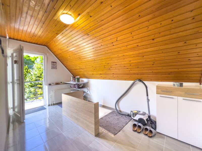 A telek végében ősfás erdő, kertben gyümölcsfák vannak.Ház alatt garázs ás tároló található..A házban található:Földszint: