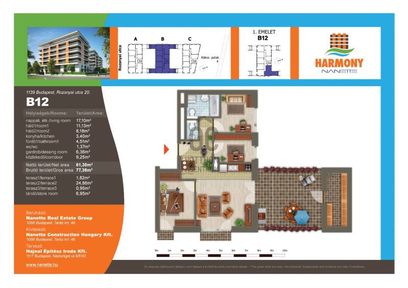 Kényelem és zöldövezeti nyugalom találkozik ebben a XIII. kerületi, Rozsnyay utcai otthonban. A 61 m²-es, amerikai konyhás nappalival és három hálószobával rendelkező lakás a családbarát elosztása és a tágas kültéri terei miatt egyaránt különleges.A LAKÁS JELLEMZŐI- nettó 61, bruttó 77 m² alapterület- amerikai konyhás nappali + 3 hálószoba- 25 m² nagy terasz, további két erkély- 7 m² tároló a teraszról nyílva- kádas fürdőszoba WC-vel- vendég WC kézmosóval- házközponti fűtés egyedi méréssel- légkondicionáló, redőny, szúnyogháló- gépesített konyha, szigetes konyhabútor- beépített szekrények, gardróbok- riasztó és biztonságos lakóparki környezet- teljes bútorzat gépekkel együtt további 1 millió FtA HÁZ ÉS KÖRNYEZET- 2013-ban épült, liftes társasház- rendezett és biztonságos, kamerarendszerrel felszereltKÖRNYÉK ÉS LOKÁCIÓ- a társasház közvetlen szomszédságában található a Rákos-patak sétánya futópályával, kerékpárúttal, sport- és játszóterekkel, kutyafuttatóval- a Vasas sporttelep néhány lépésre elérhető- bevásárlási lehetőségek (Duna Plaza, LIDL, ALDI, Tesco, CBA) pár perc távolságra. A közlekedés kiváló, M3-as metrómegálló és több buszjárat gyorsan elérhetőPARKOLÁS- a lakáshoz tartozik egy mélygarázs beállóhely, amely kötelezően megvásárolandó 6,5 millió forintért- könnyen parkolható, biztonságos helyet kínál az autójánakEZ AZ OTTHON IDEÁLI VÁLASZTÁS:- családoknak, akik értékelik a több hálószobás elosztást,- sportos, aktív életmódot kedvelőknek,- kutyásoknak és természetkedvelőknek, akik közvetlenül a zöldövezet mellett szeretnének élni.A lakás azonnal költözhető, igényes kialakításának és tágas teraszainak köszönhetően igazán különleges otthont kínál a XIII. kerület egyik legjobb részén.Várom hívását a hét bármely napján!Ez az ingatlan a \"Hűség csomag\" megbízási portfólióhoz tartozik. Részletek az Otthon Centrum weboldalán.