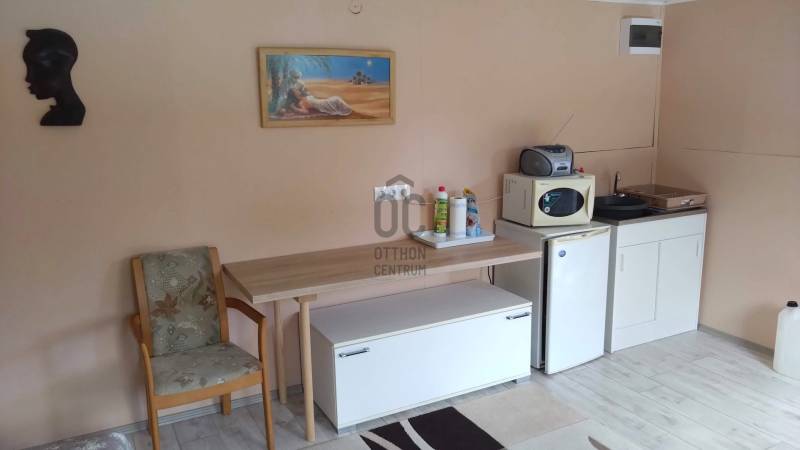 Eladó Szombathelyen az oladi és a kámoni városrész között egy 25 nm-es szigetelt, könnyűszerkezetes nyaraló 25 nm-es terasszal és 2396 nm-es telekkel.A ház kifogástalan állapotban van, hőszigetelt műanyag nyílászárókkal, külön WC-vel, víz és villany van, akár állandó lakhatásra is alkalmas. Az ingatlan gyönyörű természeti környezetben található, 1 km-es, változó minőségű földúton közelíthető meg, a városközpont pár perc alatt elérhető. A nagyméretű telek ( 100x30 m ) teljesen sík, folyamatosan gondozott, különféle gyümölcsfákkal, díszcserjékkel és fákkal beültetett, a nyüzsgő városi élettől való elvonulás teljes mértékben biztosított, a kertben egy fúrt kút és egy szerszámtároló is rendelkezésre áll.Az önálló helyrajzi számú ingatlan \"kert és gazdasági épület\" besorolású, a tulajdonviszonyok rendezettek, azonnal birtokba vehető, a vételár a teljes berendezést tartalmazza, hitel és lakcímkártya nem igényelhető.Irányár: 17,9 MFt.Opcionálisan a szomszédos, teljesen azonos adottságú, 2396 nm-es telek ( lakóház nélkül ) is megvásárolható 7,5 MFt-ért.