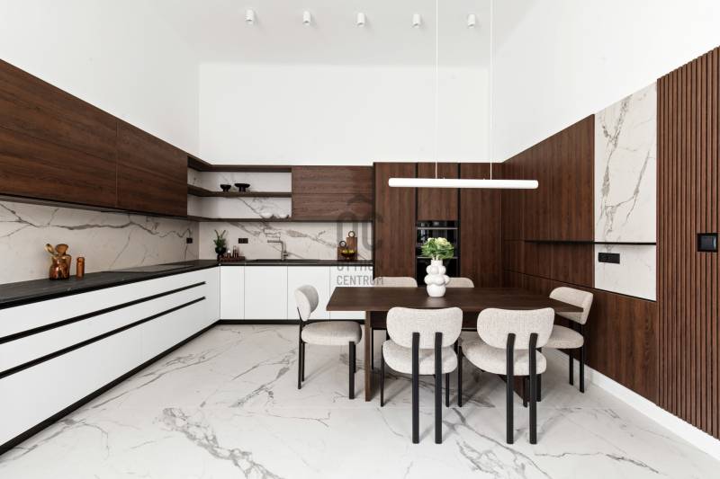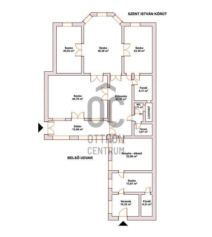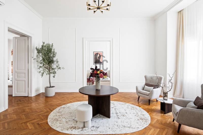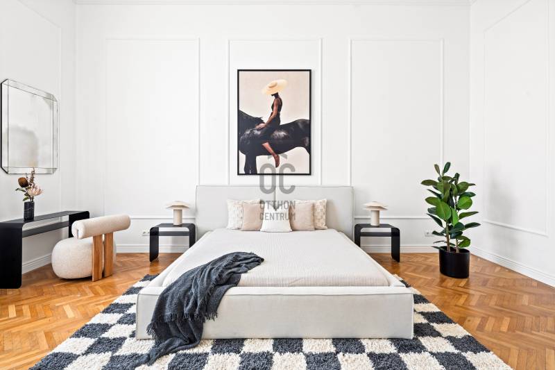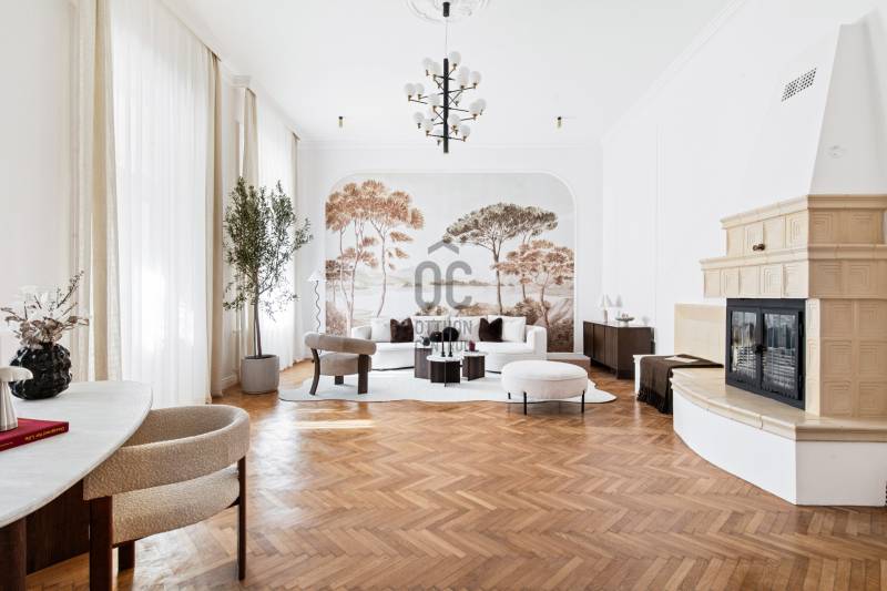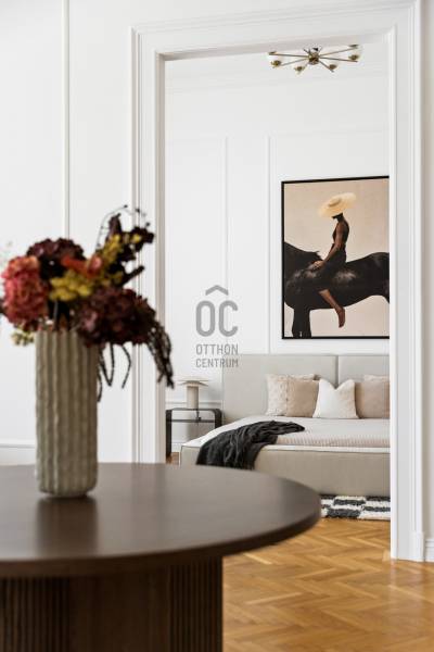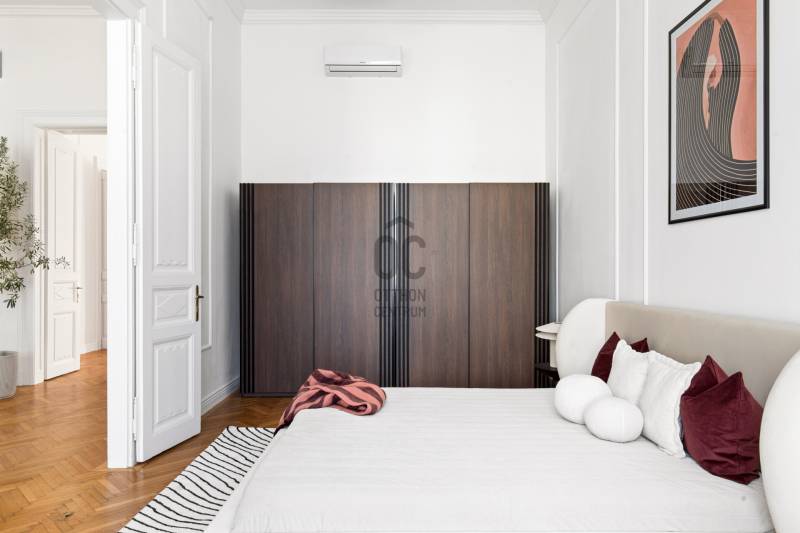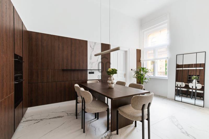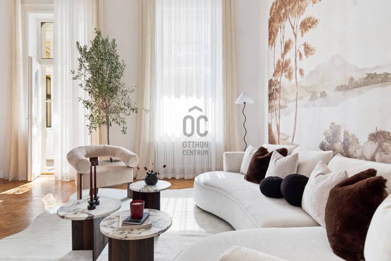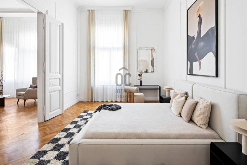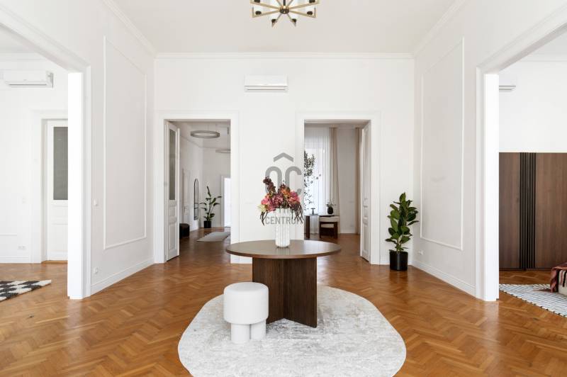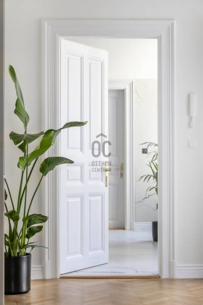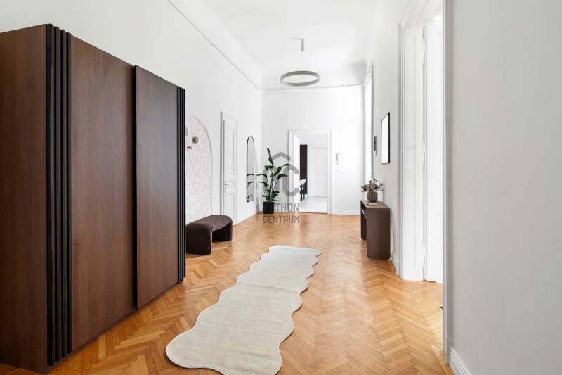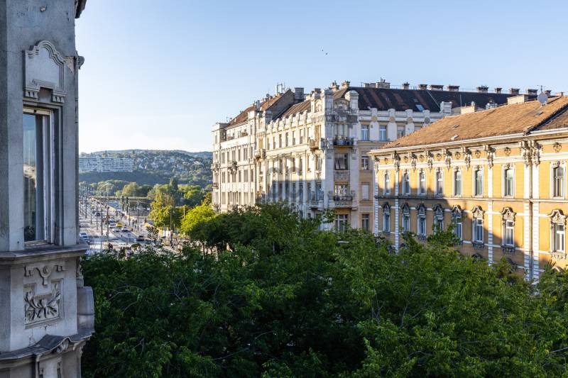 Igazi ritkaság, amikor az V. kerületben ekkora lakást szétválasztás előtti állapotában lehet megvásárolni. Jó ízléssel, igényesen felújították, így Ön azonnal élvezheti a valódi nagypolgári életérzést. Üdv itthon!RÖVID ÖSSZEFOGLALÓBudapest V. kerületében, a Szent István körúton, jó állapotú, nagypolgári, liftes ház 3. emeletén található az ingatlan, mely meghökkentően tágas a maga 229 m² -vel, amihez hozzájön még a 10,3 m²-es veranda is, világos, 5 szobás, külön konyhás, kettő fürdőszoba + külön wc-s, felújított, Wi-Fi vezérelt padlófűtéses, elektromos redőnyökkel felszerelt és videós megfigyelőrendszerrel őrzött lakás keresi új, boldog tulajdonosát.LIPÓTVÁROSA Szent István körút Budapest egyik legdinamikusabb és legkeresettebb városi tengelye. A ház a Nyugati tér és a Jászai Mari tér között található, a főváros egyik legfrekventáltabb, mégis rendezett részén. A 4–6-os villamos, az M3-as metró és több buszjárat néhány perc sétával elérhető, így az elhelyezkedés nemcsak kényelmes, hanem stratégiai szempontból is kiemelkedő.A környék arculatát elegáns üzletek, kifinomult éttermek és modern irodaházak formálják, miközben a Duna-part és a Margit-sziget közelsége különleges életminőséget kínál.Az itt található ingatlanok értéktartása és bérbeadási potenciálja kiemelkedő – a körút prémium státusza stabil alapot teremt mind a hosszú távú befektetők, mind az igényes városi életet keresők számára.SZENT ISTVÁN KÖRÚT 7.Az épület a századfordulós, historizáló építészet jellegzetes példája, amelyet Szabó Gyula tervezett 1901–1902-ben. A homlokzatán fellelhetők a neobarokk és eklektikus stílusjegyek, amelyek a korszak nagyvárosi bérházaira jellemzőek: díszes kőkeretek, klasszikus arányrendszer és ornamentikus részletek. Az épület méltóságteljes megjelenése és tágas belső terei a polgári életforma eleganciáját tükrözik, miközben a Nagykörút karakteres városképéhez is szervesen hozzájárul.A fenntartási költsége a méretéhez képest igen kedvező, a közös költség 75.000 Ft havonta, amely az alap szolgáltatásokat tartalmazza.LAKÁSA nappali – klasszikus arányok, modern kifinomultságA tágas nappali az otthon központi tere, ahol minden részlet a kényelmet és a harmóniát szolgálja. Különálló elhelyezkedése lehetőséget ad arra, hogy a nap végén elvonuljon a város lüktetésétől – egy hely, ahol lelassulhat, megérkezhet, és újra feltöltődhet.A nagy belmagasság, a gondosan felújított parketta és a finom stukkódíszítés elegáns, polgári atmoszférát teremt.A működő kandalló pedig különleges élményt ad: ritka érzés, amikor a belváros szívében valódi tűz melege tölti meg a teret. Őszi estéken egy pohár borral, karácsonykor pedig a fények játéka, a tűz pattogó hangja egészen egyedülálló hangulatot varázsol.Ez a nappali egyszerre reprezentatív és bensőséges – olyan tér, ahová jó megérkezni, és ahonnan nehéz elindulni.Klasszikus \"pillangó\" alaprajz – átgondolt térszervezésA lakás egyik részén, ahol a szobák helyezkednek el, a klasszikus \"pillangó\" alaprajzot fedezhetjük fel, amely tökéletes arányokat és harmonikus térkapcsolatokat biztosít. A központi szobából két irányba nyíló helyiségek praktikus és élhető elrendezést eredményeznek, amely egyszerre biztosítja a tágasságot és az intimitást. Ez az alaprajz kifejezetten kedvez a nagyobb családoknak vagy azoknak, akik egy rugalmasan alakítható otthont keresnek.A konyha – tér és funkcionalitásA nagy konyha külön helyiségben kapott helyet, így ideális lehet akár egy exkluzív konyha-étkező kialakítására is. A nagy ablakfelületeknek köszönhetően minden helyiség világos, a természetes fény pedig tovább növeli a tágas érzetet. Az elrendezés és a nagyobb munkafelületek révén kényelmesen használható, a klasszikus lakásokra jellemző praktikussággal kialakítva. A felújítás során modern stílusú bútorok kerültek beépítésre, melyek mégis harmonikusan illenek a nagypolgári hangulatot idéző térbe. Beépített sütő, mikrohullámú sütő, mosogatógép is a konyha része.A fürdőszobák – polgári elegancia modern kényelemmelA lakásban három fürdőszoba található, amelyek kialakítása ötvözi a klasszikus eleganciát a korszerű megoldásokkal. Két teljes értékű fürdőszoba, valamint egy vendégmosdó szolgálja a kényelmet. Az egyik fürdőszoba tágas, káddal és zuhanyzóval egyaránt felszerelt – kompromisszumoktól mentesen –, míg a másik zuhanykabinos kialakítású. A kifinomult burkolatok és az időtálló szaniterek a minőségi otthon érzetét erősítik. Sötét, márványmintás burkolatok teszik egyedivé, és igazán elegánssá ezeket a helyiségeket.Hasznos tudnivalók- A lakás két bejárattal rendelkezik: egyik a főlépcsőházból és a lifttől, a másik a csendesebb szervizlépcsőházból nyílik, ami praktikus lehetőség a különböző funkciók elkülönítésére.- Külön figyelmet érdemel a lakáshoz tartozó veranda, amely jelenleg tágas tárolóként funkcionál, de akár más célra is átalakítható – a szomszédos lakásokban ebből a térből különálló szobák lettek kialakítva.- Korszerű okos-otthon-megoldásokkal rendelkezik: Wi-Fi vezérelt padlófűtés, radiátorok, elektromos redőnyök és videós megfigyelőrendszer biztosítják a modern kényelmet.- A lakás egyik különleges vonzereje az egyedülálló kilátás a Margit hídra, amely még inkább kiemeli ennek az ingatlannak a páratlan értékét.- A vételár tartalmazza a beépített bútorokat, az ingóság további 10 M Ft- ért megvásárolható. ÖSSZEGZÉSEz a lakás tökéletes választás nagyobb családosok, reprezentatív irodát/ren