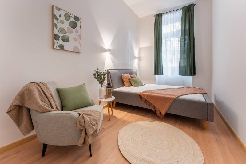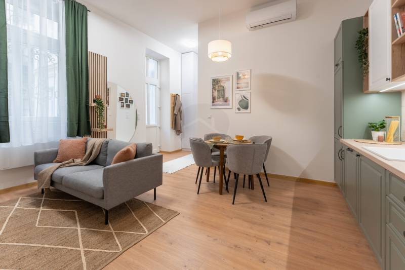 VI. kerület közkedvelt részén, Nyugati tértől pár lépésnyire eladó egy teljes körűen felújított, 54 m²-es, nappali + 2 hálós lakás.Főbb jellemzők: Napfény a lakásban minden oldalról Kiemelt lokáció, mégis csendes lakás Gyönyörű liftes ház, 4. emeleti utcai és udvari fekvés vegyesen külön fürdő, külön mellékhelyiség teljes berendezés az árban, a bútorzat igény szerint cserélhető beépített gardróbszekrények elkészítése benne van az árbanA környék kiemelkedően jó infrastruktúrával rendelkezik: éttermek, kávézók, mozi,fitneszterem, bevásárlási lehetőségek mind pár perc sétára elérhetők, a közlekedéspedig kiváló (M3-as metró, 4-6 villamos, számos troli és buszjárat).A lakás 2 hét múlva lesz kész, a képeken egy másik referenciamunka látható,design-ban kisebb eltérés várható.