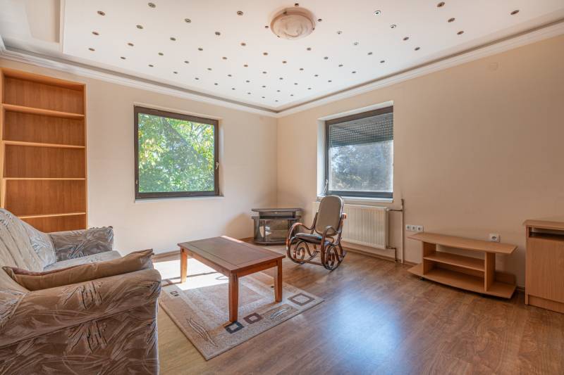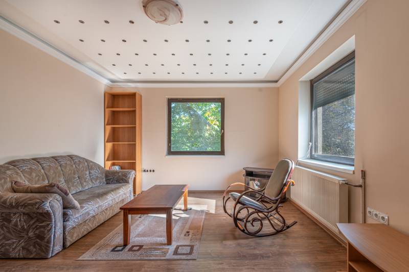A Rákoskert domboldalában, a Fuvaros utcában található családi ház a felújítás után ideális otthona lehet nagycsaládnak vagy 2 generációnak is. A ház egy 725 nm-es lejtős telekre épült a 80-as évek végén. Három szinten, 2 külön lakrész és akár 7 szoba is kialakítható. Az épület statikailag rendben van, nem sülyed, nem vizesedik. ALSÓ SZINT: Az utca felőli oldalon egy tágas garázs található, szerelőaknával. Mellette a kazánház-műhely-tároló. Az udvar felől egy garzon lakás lett kialakítva, lejtős telek révén ez egy földszinti lakás, nem szuterén. Szoba, konyha-étkező, fürdőszoba, WC. Közvetlen kijárattal a kertbe, egy nagy teraszra. A lakás a garázs felől ajtóval leválasztható, az utca és a kert felől is megközelíthető. KÖZÉPSŐ SZINT: Kis ráfordítással gyorsan lakhatóvá tehető, nappali + 2 szoba, étkező, konyha, kamra, fürdőszoba, WC kialakításban. Az étkezőhöz kapcsolódó terasz nyáron árnyékos, ideális kiterjesztése az étkezőnek, grillező és pihenőhely lehet. TETŐTÉR: A tetőtérben 3 szoba, fürdőszoba, WC, tároló helyiségek kialakítása kezdődött meg. A tetőtéri erkélyről a kert rendezése után a szemközti dombok panorámája tárulhat elénk. GÉPÉSZET, MŰSZAKI PARAMÉTEREK:A ház elkezdett felújítása során az elektromos hálózat teljesen elkészült. Új kondenzációs gázkazán került beépítésre, meghagyva a régi vegyestüzelésű lehetőséget is. Jelenleg a meleg vizet a tetőtérben elhelyezett 120 literes villanybojler szolgáltatja, de ráköthető az új gázkazánra is. Az épület teherhordó falai 40 cm vastag falazóblokkból készültek, a fa nyílászárók hőszigetelt üvegezésűek. Az udvar hátsó részén található még egy 30 nm hasznos alapterületű tégla épület, műhely-raktár funkciókkal. Az utcáról lehetőség van még több gépkocsi beállására is. RÁKOSKERT: A zöldövezeti nyugalom Budapest szélén. Azoknak ideális, akik szeretnének Budapesten élni, de a kertes házas, zöldövezeti környezetet, a nyugalmat és a közösségi életet részesítik előnyben. Rákoskert népszerű lakóhely, ami főként a kertvárosi jellegének és a természeti közelségének köszönhető.A természet közelség és a magasabb fekvés:•Kertvárosi hangulat: A városrész jellege a budai kerületekhez hasonlít, sok utcája lejtős, ami egyedi látképet kölcsönöz neki. A kellemes környezet miatt kedvelt lakóterületnek számít.•Vidadomb: Rákoskert legmagasabb pontja (kb. 200 méter), ahonnan szép panoráma nyílik a közeli védett Merzse-mocsárra és a Ferihegyi repülőtérre. A domb a helyi közösségi élet fontos helyszíne, ahol rendszeresen rendeznek koncerteket, ünnepségeket. Itt található játszótér, focipálya és felnőtt kondipark is.•Merzse-mocsár: A XVII. kerület területén található a 27 hektáros Merzse-mocsár, amely Budapest egyik legháborítatlanabb vizes élőhelye és természetvédelmi terület, ami ideális célpont a természetkedvelőknek, futóknak, kirándulóknak. Tömegközlekedéshez a buszmegálló pár perc séta. A XVII. kerület központja, a Fő tér (piac, szakorvosi rendelő, Polgármesteri Hivatal, bankfiókok, gyógyszertár, üzletek, cukrászda, ……..) 15 perc alatt elérhető. Gépkocsival az M0 5 perc. A maglódi bevásárlóközpont (Auchan, Decathlon, Bauhaus) szintén. Liszt Ferenc Repülőtér 15 perc.