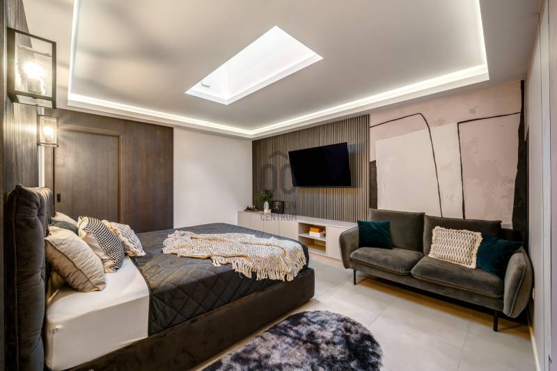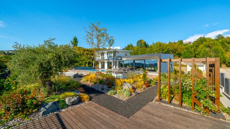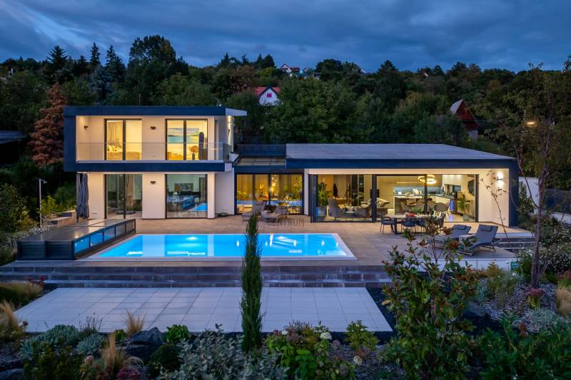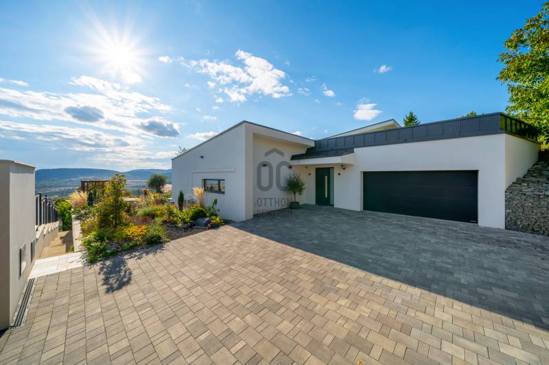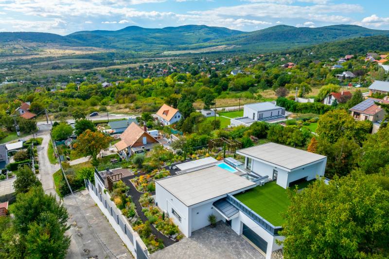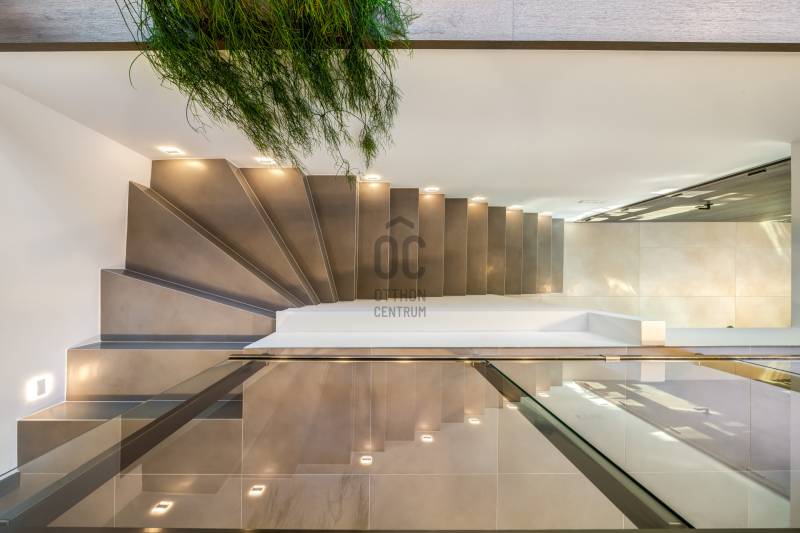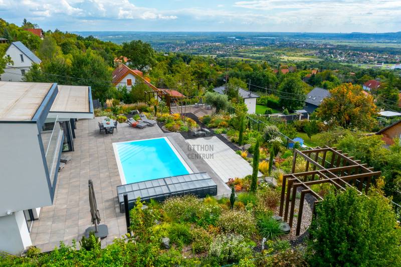 Egy hely, mely inspirál, energetizál, ahol önmagad lehetsz. Ebben a környezetben nincs legyőzhetetlen akadály. Üdv itthon! RÖVID ÖSSZEFOGLALÓSzentendrén, Szarvahegyen, a panorámás Tambura utcában – eladó ez a 278 m²-es, kétszintes, négy hálószobás, három fürdőszobás modern családi ház.A tágas terek, a medence, a kétállásos garázs, a hőszivattyús padlófűtés és mennyezethűtés, valamint a dél–nyugati fekvésű, zavartalan kilátás mind azt szolgálják, hogy itt a mindennapok álomszerűek lehessenek.Egy ház, ahol a fény mozdulatot formál, és a tér minden napszakban más arcát mutatja.Szentendre – és benne SzarvashegySzentendre sosem csupán város, inkább egy finoman pulzáló önálló világ melynek egyedi miliője semmihez sem hasonlítható. Kicsit olaszos, kicsit mediterrán - macskaköves utcái által mesebeli világba csöppen az ember és szinte észrevétlenül lelassítja lépteit.Szarvashegy az egyik legnemesebb pontja: levegője tiszta, a fák között átszűrődő fény pedig minden órában más hangulatot ad a tájnak. Innen a város látványa festményszerű – a házak teteje, a Duna kékje, a Pilis sziluettje együtt rajzolja ki azt a képet, amit naponta látva sem lehet megunni.A Tambura utca a domboldal csendes, zöld szeglete, ahol a naplemente a hegyek mögül lép elő, és estére borostyánfénybe burkolja a kertet. A környék ideális családoknak: iskola, óvoda, helyi bolt, pékség és sportpályák néhány percre, a belváros pedig tíz perc alatt elérhető.Aki Szarvashegyen él, tudja, hogy innen minden elérhető – csak épp nem kell rohanni érte.Egy vasárnap reggel a Pékműhely kovászos kenyereivel, délután séta a Bükkös-patak partján, este egy csendes borozás a teraszon — ezek nem programok, hanem ritmusok, amik idővel az élet részévé válnak.Kívül – a táj részekéntA Tambura utcai ház a domboldal természetes vonalait követi – nem uralja, inkább kiegészíti a tájat. A letisztult, modern forma, a beton és üveg finom játéka tökéletes ritmust talál a körülötte lélegző zölddel.A homlokzat kétszintes arányai határozottak, de nem szigorúak; a horizontális vonalak és a nagy üvegfelületek között megmarad az egyensúly, amelytől a ház – bár kortárs – mégis meleg és élhető.A kert lépésről lépésre tárul fel, mintha egy gondosan komponált sétaút lenne. Az illatos növények és örökzöldek keverednek az évelő virágokkal, majd a tekintet lassan a medence irányába vezet. A víztükör szinte egybeolvad a látóhatárral – az ég és a táj közötti határ elmosódik.A növényzet nem díszlet: levendula, olajfa, díszfüvek és kőágyások teremtik meg azt a mediterrán hangulatot, amely nyáron élettel tölti meg a kertet, télen pedig elegánsan visszafogott marad.A terasz tágas, természetes kőburkolata a medencével együtt a ház szíve. Itt minden a kilátásra épül – a Pilis lágy ívei, a Duna csillanása és Szentendre fényei alkotják azt a látványt, amely nemcsak díszlet, hanem a mindennapi élet része.Ahogy a nap lemegy, a medence fénye lassan átveszi a természet szerepét: a víz kékje dereng, a ház üvegfelületein megcsillan az esti fény, és a kert halk esti zsongásában az ember szinte észrevétlenül lelassul.Belül – tér, fény, ritmusAhogy belépünk, az első érzés a tágasság. A nagy üvegfelületeken át a tekintet szinte azonnal a kertbe fut, mintha a külső tér folytatódna a nappaliban. A beton mennyezet karaktere határozottságot ad, míg a meleg árnyalatú padló és a bársonyosan puha textíliák lágyítják a struktúrát – a ház egyszerre hűvös és otthonos, mint egy mély levegővétel a nyári délutánban.A nappali–étkező–konyha egyetlen folytonos tér, ahol a fény a legfontosabb szereplő. Reggel finoman áttör a függönyökön, délután táncol a márványfelületeken, estére pedig aranyló derűt von a bútorokra. A konyha központi eleme a természetes kősziget, amely egyszerre funkcionális és látványelem – itt zajlik a mindennapi élet, mégis marad benne valami ünnepélyes.A lépcső, amellyel az emeletre érkezünk, szinte szoborszerű. A lebegő hatású, fényekkel kísért fokok nemcsak közlekedést szolgálnak, hanem finom ritmust adnak a belső térnek – ahogy lépsz, a ház is mozdul veled.A hálószobák már más hangon szólnak. A főhálóban a mennyezeti ablakon át a nap első fényei puhán szűrődnek be, a falakon természetes tónusok, a textúrák között sötét fa és puha szövet váltakozik. Itt minden a pihenésről szól: a csendről, ami nem üresség, hanem jelenlét.A fürdőszobák az anyagok harmóniájára építenek: kő, üveg és fény dolgozik együtt, hogy a napi rutinból rítus legyen. Minden részlet átgondolt – a burkolatok mintája, a rejtett világítás, a terek aránya mind azt a gondoskodást tükrözik, amely ezt a házat áthatja.Ebben az otthonban nincs semmi véletlen. Minden vonal a kilátásra, minden ablak a fényre, minden anyag az időre van hangolva.A külső és belső terek között nincsen határ – inkább egyfajta lassú átmenet, mint amikor a naplemente színei fokozatosan olvadnak át az esti fénybe.Ez a ház nem egyszerűen épült – komponálták.Amennyiben szeretné személyesen is megtapasztalni ennek az otthonnak egyedülálló atmoszféráját, várom megkeresését.