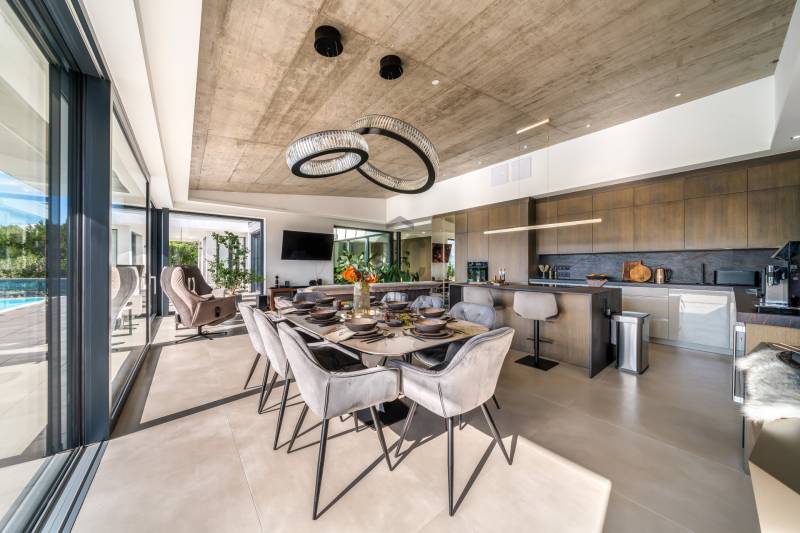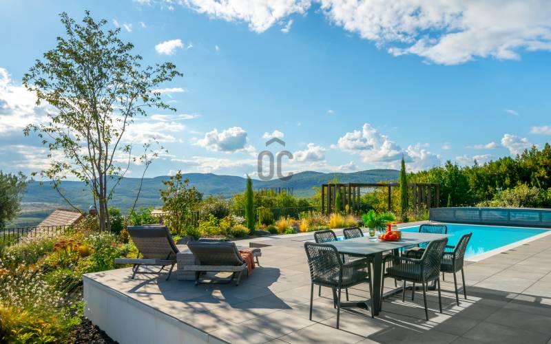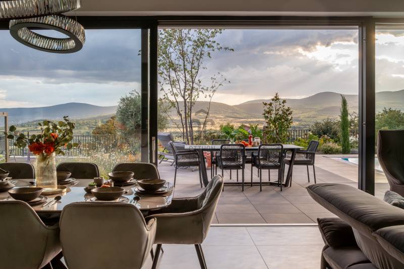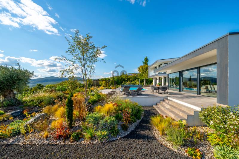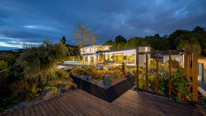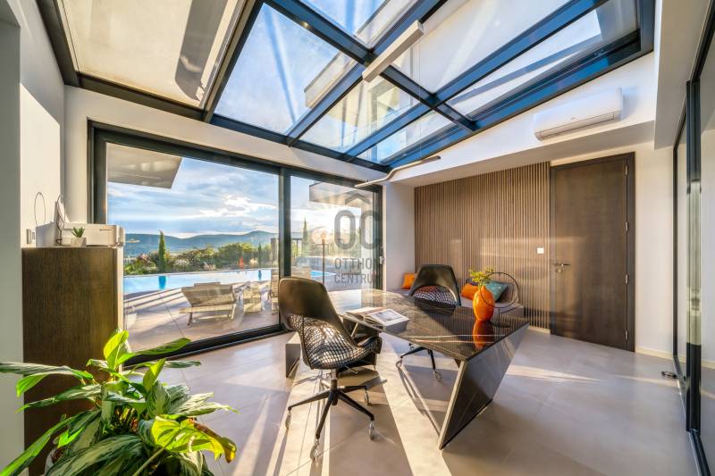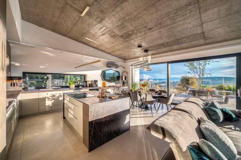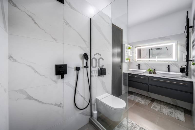 Egy hely, mely inspirál, energetizál, ahol önmagad lehetsz. Ebben a környezetben nincs legyőzhetetlen akadály. Üdv itthon! RÖVID ÖSSZEFOGLALÓSzentendrén, Szarvahegyen, a panorámás Tambura utcában – eladó ez a 278 m²-es, kétszintes, négy hálószobás, három fürdőszobás modern családi ház.A tágas terek, a medence, a kétállásos garázs, a hőszivattyús padlófűtés és mennyezethűtés, valamint a dél–nyugati fekvésű, zavartalan kilátás mind azt szolgálják, hogy itt a mindennapok álomszerűek lehessenek.Egy ház, ahol a fény mozdulatot formál, és a tér minden napszakban más arcát mutatja.Szentendre – és benne SzarvashegySzentendre sosem csupán város, inkább egy finoman pulzáló önálló világ melynek egyedi miliője semmihez sem hasonlítható. Kicsit olaszos, kicsit mediterrán - macskaköves utcái által mesebeli világba csöppen az ember és szinte észrevétlenül lelassítja lépteit.Szarvashegy az egyik legnemesebb pontja: levegője tiszta, a fák között átszűrődő fény pedig minden órában más hangulatot ad a tájnak. Innen a város látványa festményszerű – a házak teteje, a Duna kékje, a Pilis sziluettje együtt rajzolja ki azt a képet, amit naponta látva sem lehet megunni.A Tambura utca a domboldal csendes, zöld szeglete, ahol a naplemente a hegyek mögül lép elő, és estére borostyánfénybe burkolja a kertet. A környék ideális családoknak: iskola, óvoda, helyi bolt, pékség és sportpályák néhány percre, a belváros pedig tíz perc alatt elérhető.Aki Szarvashegyen él, tudja, hogy innen minden elérhető – csak épp nem kell rohanni érte.Egy vasárnap reggel a Pékműhely kovászos kenyereivel, délután séta a Bükkös-patak partján, este egy csendes borozás a teraszon — ezek nem programok, hanem ritmusok, amik idővel az élet részévé válnak.Kívül – a táj részekéntA Tambura utcai ház a domboldal természetes vonalait követi – nem uralja, inkább kiegészíti a tájat. A letisztult, modern forma, a beton és üveg finom játéka tökéletes ritmust talál a körülötte lélegző zölddel.A homlokzat kétszintes arányai határozottak, de nem szigorúak; a horizontális vonalak és a nagy üvegfelületek között megmarad az egyensúly, amelytől a ház – bár kortárs – mégis meleg és élhető.A kert lépésről lépésre tárul fel, mintha egy gondosan komponált sétaút lenne. Az illatos növények és örökzöldek keverednek az évelő virágokkal, majd a tekintet lassan a medence irányába vezet. A víztükör szinte egybeolvad a látóhatárral – az ég és a táj közötti határ elmosódik.A növényzet nem díszlet: levendula, olajfa, díszfüvek és kőágyások teremtik meg azt a mediterrán hangulatot, amely nyáron élettel tölti meg a kertet, télen pedig elegánsan visszafogott marad.A terasz tágas, természetes kőburkolata a medencével együtt a ház szíve. Itt minden a kilátásra épül – a Pilis lágy ívei, a Duna csillanása és Szentendre fényei alkotják azt a látványt, amely nemcsak díszlet, hanem a mindennapi élet része.Ahogy a nap lemegy, a medence fénye lassan átveszi a természet szerepét: a víz kékje dereng, a ház üvegfelületein megcsillan az esti fény, és a kert halk esti zsongásában az ember szinte észrevétlenül lelassul.Belül – tér, fény, ritmusAhogy belépünk, az első érzés a tágasság. A nagy üvegfelületeken át a tekintet szinte azonnal a kertbe fut, mintha a külső tér folytatódna a nappaliban. A beton mennyezet karaktere határozottságot ad, míg a meleg árnyalatú padló és a bársonyosan puha textíliák lágyítják a struktúrát – a ház egyszerre hűvös és otthonos, mint egy mély levegővétel a nyári délutánban.A nappali–étkező–konyha egyetlen folytonos tér, ahol a fény a legfontosabb szereplő. Reggel finoman áttör a függönyökön, délután táncol a márványfelületeken, estére pedig aranyló derűt von a bútorokra. A konyha központi eleme a természetes kősziget, amely egyszerre funkcionális és látványelem – itt zajlik a mindennapi élet, mégis marad benne valami ünnepélyes.A lépcső, amellyel az emeletre érkezünk, szinte szoborszerű. A lebegő hatású, fényekkel kísért fokok nemcsak közlekedést szolgálnak, hanem finom ritmust adnak a belső térnek – ahogy lépsz, a ház is mozdul veled.A hálószobák már más hangon szólnak. A főhálóban a mennyezeti ablakon át a nap első fényei puhán szűrődnek be, a falakon természetes tónusok, a textúrák között sötét fa és puha szövet váltakozik. Itt minden a pihenésről szól: a csendről, ami nem üresség, hanem jelenlét.A fürdőszobák az anyagok harmóniájára építenek: kő, üveg és fény dolgozik együtt, hogy a napi rutinból rítus legyen. Minden részlet átgondolt – a burkolatok mintája, a rejtett világítás, a terek aránya mind azt a gondoskodást tükrözik, amely ezt a házat áthatja.Ebben az otthonban nincs semmi véletlen. Minden vonal a kilátásra, minden ablak a fényre, minden anyag az időre van hangolva.A külső és belső terek között nincsen határ – inkább egyfajta lassú átmenet, mint amikor a naplemente színei fokozatosan olvadnak át az esti fénybe.Ez a ház nem egyszerűen épült – komponálták.Amennyiben szeretné személyesen is megtapasztalni ennek az otthonnak egyedülálló atmoszféráját, várom megkeresését.