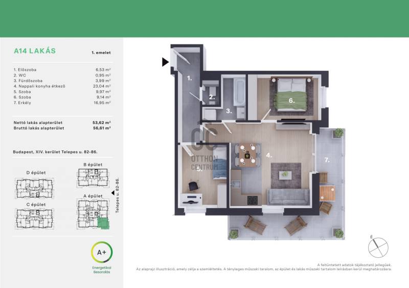 Projekt bemutatásaA Daisy Liget Zugló csendes részén épül, közel a Bosnyék térhez. A megújult kertvárosias környezet a pesti oldal egyik legkedveltebb részei közé tartozik, az itt élők egyszerre élvezhetik a csöndes kis utcák nyugalmát és a belváros közelségét. A Bosnyák téren mindent megtalálunk ami a hétköznapi élethez szükséges: a Zenit corso bevásárlóközpontot, a Bosnyák téri piacot, patikát, éttermeket és kávézókat.Számos óvodát, általános iskolát, játszóteret és sportközpontot is találunk a 10 perces sétatávolságon belül.A társasház különleges homlokzatával, egyedi fiatalos dizájnjával, kiemelkedik a környező épületek közül. A 4 emelet magas, szellősen elhelyezett épületek tökéletesen illeszkednek a környéken jellegzetes, előkertes kialakítású épületekhez.Figyelembe véve a jövő elvárásait, a társasház modern, környezetbarát, mennyezeti hűtő, -fűtő rendszerrel ellátott.Vevőinknek lehetőségük nyílik, hogy új otthonukat az utolsó részletig személyre szabják: változtathatnak az ingatlann elosztásán, széles kollekcióból választhatnak meleg- és hideg burkolatokat, szanitereket. Az alapáras burkolatokon felül, elérhetőek feláras termékek is, mely biztosítja, hogy olyan lakásban lakjanak mit megálmodtak maguknak.A jelen adatok tájékoztató jellegűek, ezért a Beruházó (sem a hirdető) azok változásával, vagy bármely attól való eltéréssel kapcsolatban semmilyen kötelezettséget, vagy felelősséget nem vállal.Az alaprajzokon ábrázolt berendezési tárgyak és bútorok, a burkolatok megjelenése nem képezi a szerződés tárgyát. A pontos felszereltségről a műszaki leírásban olvashat bővebben.Az aktuális lakáskínálatról és árakról érdeklődjön telefonon!
