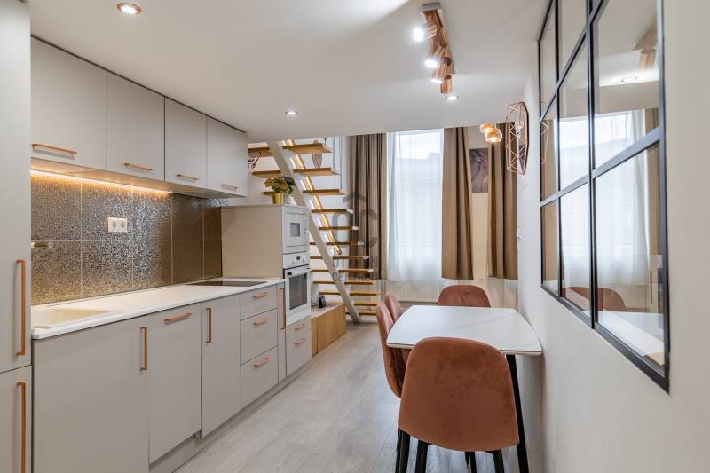 Letisztult, kompakt, kellemes tér, könnyen élhető megoldások. Üdv itthon!RÖVID ÖSSZEFOGLALÓA Magyar utca hangulatos részén, egy 19. századi, liftes polgári ház harmadik emeletén található ez a 44 m²-es, galériás, igényesen felújított lakás. A kisebb alapterület ellenére a tér átgondolt szervezése, a jó belmagasság és a nappali-galéria ritmusa kifejezetten élhető, szerethető atmoszférát hoz létre — akár saját használatra, akár befektetésként is stabil választás.Jelenleg rövid távon hasznosított. Akár a mellette lévő 25 m²-es garzon lakással együtt is megvásárolható!ELHELYEZKEDÉS – A Belváros finoman élhető oldalaA Magyar utca egyszerre csendes és jól kapcsolódó része a történelmi Belvárosnak. Pár perc sétára elérhető a Kálvin tér, az Astoria, az Egyetem tér és a Károlyi-kert; a mindennapi élethez szükséges szolgáltatások és éttermek természetes közelségben vannak.A közlekedés kiemelkedő: a közelben fut az M3 és M4 metró, a 47/49-es villamos, valamint több buszjárat is, így a város teljes struktúrája könnyen elérhető.A HÁZ – polgári karakter, liftes kényelemA századforduló környékén épült, eklektikus jegyeket őrző ház rendezett állapotú, gangos szerkezete megőrzi a kor hangulatát. A lépcsőházból lift segíti a közlekedést, ami ebben a korszakban külön értéket képvisel. Az épület helyi értékvédelmi státuszának köszönhetően az eredeti arányok és a polgári architektúra hosszú távon megmaradnak.A LAKÁS – átgondolt tér 44 m²-enA lakásba belépve egy világos, magas belmagasságú nappali fogad, amelyet a galéria határoz meg: a felső szint intimebb hálórészként működik, míg a nappali alsó tere jól szervezett, kompakt életmódot támogat. Az elrendezés rendezett, logikus, a térben minden funkció a helyére került.A fürdőszoba modern, letisztult stílusú; a konyha jól használható, a méretéhez igazodó, de kényelmes megoldásokat kínál. A lakás atmoszférája egységes, a burkolatok és a színek visszafogott, meleg hangulatot teremtenek.Felújítás és műszaki háttérA lakás teljes felújításon esett át, amely magában foglalja:– modern gépészet és elektromos hálózat– új burkolatok és felületek– korszerű fürdőszoba– praktikus, esztétikus galéria– igényes konyhai kialakításA friss műszaki tartalom biztosítja az ingatlan hosszú távú értékállóságát és alacsony ráfordítással működő üzemeltetését.Ez a 44 m²-es lakás egy szerethető, jól működő belvárosi tér, ahol a galéria, a belmagasság és az átgondolt belső kialakítás együtt teszi élhetővé a mindennapokat. Legyen szó saját otthonról vagy befektetésről, a lokáció és a koncepció stabil alapot kínál.Ha kíváncsi rá, milyen a valóságban ez a kényelmesen szervezett, hangulatos kis lakás,szívesen megmutatom. Keressen bizalommal.---------------------------------------------------------------SZOLGÁLTATÁSI ZÁRÓ BLOKKDíjmentes, bankfüggetlen hiteltanácsadással támogatjuk vevő ügyfeleinket a számukra legelőnyösebb finanszírozási döntések meghozatalában. Opcionálisan igénybe vehető kiegészítő szolgáltatásainkkal – mint ügyvédi közreműködés, energetikai tanúsítvány vagy villamos biztonsági felülvizsgálat – teljes körű szakmai támogatást nyújtunk az adásvétel folyamatának minden egyes lépésénél.A hirdetésben szereplő információk tájékoztató jellegűek.A tévedés és az árváltoztatás jogát fenntartjuk.Az esetleges elírásokért és technikai hibákért felelősséget nem vállalunk.