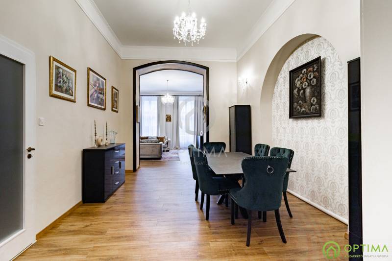 TELJESKÖRŰEN FELÚJÍTOTT, 2 SZOBÁS LAKÁS A PALOTANEGYEDBEN Budapest VIII. kerületének legkeresettebb városrészében, a Palotanegyedben, a Szentkirályi utcában kínálom megvételre ezt a 95 m2 alapterületű, I. emeleti, 2 szobás téglalakást. A ház külső és belső homlokzata is kiváló állapotban van. A lakás egy külön zárt folyosóról közelíthető meg, így csak 1 közvetlen szomszéd van. A lakás TELJES KÖRŰ felújításon esett át ebben az évben: - cserére kerültek a vezetékek (villany-, gáz- és vízvezetékek egyaránt), - beépítésre kerültek új hang- és hőszigetelő műanyag ablakok, - cserére kerületek a burkolatok a konyhában és a fürdőben egyaránt, - beépítésre került egy gépesített konyhabútor,- kialakításra került a cirkó fűtés, - beépítésre került légkondicionáló. A közös költség összege havonta 29.000 Ft, amely tartalmazza a szokásos tételeket, mint a LIFT használatot, a szemét elszállítását, a lépcsőház tisztántartását. A közüzemi fogyasztások mind egyedi mérőórák alapján kerülnek elszámolásra. A KÉPEKEN LÁTHATÓ BÚTOROK ÉS BERENDEZÉSI TÁRGYAK A VÉTELÁR RÉSZÉT KÉPEZIK. Az ingatlan BELVÁROSI elhelyezkedésének köszönhetően BEFEKTETÉSI céllal való vásárlása is kitűnő választás lehet. A lakás megtekintése miatt VÁROM HÍVÁSÁT akár hétvégén vagy az esti órákban egyaránt!