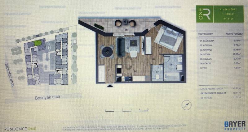 Budapest 14. kerületében, Zugló új városközpontjában magas minőségben megépített, 2024-ben átadott Zenit Residence-ben eladó kiváló állapotú 47 nm-es, 2 szobás, 11,3 nm-es erkélyes letisztult stílusú első emeleti lakás. - A XIV. kerület szívében, a Bosnyák tér mellett épül többfunkciós városnegyed.- Komplexum korszerű geotermikus energiával válnak fenntarthatóvá, valamennyi épület A++ kategóriájú, vagyis minimális energiaigényű lesz.- A kétszintes mélygarázsban egy autó számára biztosított hely mely kötelezően megvásárlandó, valamint egy 5 nm-es önálló táróló (12 M Ft + 5 M FT)- A belső udvarban egyedileg tervezett kertben pihenhetünk, árnyas fák, padok és gyermek játszótér vár minket.- Födémbe integrált mennyezet hűtő-fűtő rendszer került beépítésre. - Fürdőszobák elektromos padlófűtéssel és törölközőszárítós radiátorral kerülnek kialakításra.- Külön helyiségben kapott helyet egy kézmosós mosdó.- 47 négyzetméteres ingatlan 2 tágas szobával rendelkezik, így bőséges teret biztosít a mindennapi élethez.- Közvetlen közelben a Zenit Corso, ahol minden bolt, szolgáltatás, bank, patika, vendéglátóhely rendelkezésünkre áll ahogy kilépünk az ajtón.- Bosnyák piac is ránk vár, ha igazi autentikus bevásárlásra vágynánk a kofáktól.- A főváros XIV. és XV. kerületeknek egyik fő közlekedési csomópontja a Bosnyák tér.- Számos buszvonal, gyorsjárat és kötött pályás közlekedési lehetőség áll rendelkezésre, hogy a város bármely részére eljussunk könnyedén.- Ideális választás lehet akár saját otthont keresünk, akár befektetési céllal érdeklődnél.- A környék fejlődése és a kereslet növekedése biztosítja, hogy ingatlanod jövőbeli értéke tovább emelkedjen.- Ez a lakás nemcsak egy új otthon, hanem egy lehetőség is, hogy egy csendes, de mégis központi helyen élj, ahol minden kényelem és szolgáltatás a közelben van.Amennyiben felkeltette érdeklődésed ez a remek ingatlan, bátran keress és nézzük meg!