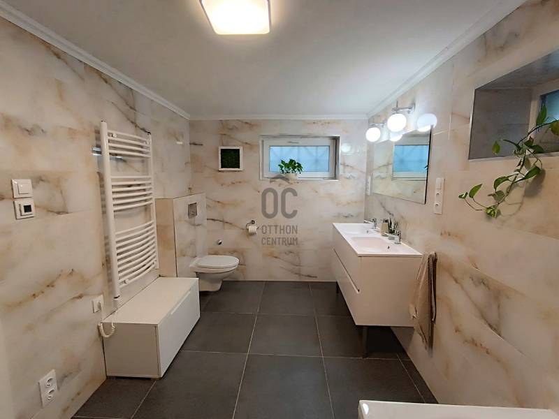 Ezt a gondosan karbantartott, felújított ingatlant látnod kell! Ha csendes, természetközeli környezetre vágysz, mégis Budapest közelében maradnál, akkor ez az ingatlan remek választás lehet.A telek és a külső tér:-769 m² gondozott kert rengeteg dísznövénnyel-Automata öntözőrendszer-15 m²-es, vörösfenyőből készült kerti kiülő-Elektromos kapu, fedett kocsibeálló-Tüzifatároló, fészer-Utcán ingyenes parkolásKözművek:-Villany: 3×20A-Víz: bekötve-Szennyvíz: emésztő-Csatorna az utca egy részén már rendelkezésre áll, bővítése folyamatbanAz épület és a műszaki állapot:-Homlokzat és padlástér szigetelt-Korszerű elektromos hőtárolós kályhák (éjszakai áramról)-Hűtő-fűtő klíma-Fürdőben padlófűtés + törölközőszárító-Konyhában és étkezőben elektromos panel + modern fatüzelésű hőtárolós kályha-2021-ben cserélt, 3 rétegű műanyag nyílászárók-Teljes gépészeti felújítás: új villanybojler, vezetékek, fűtésrendszer, klíma, beépített konyhai gépekKülönlegesség:Az emeleten található egy fűthető, hangulatos télikert, ahonnan gyönyörű panoráma tárul elénk!Helyiségek – 90 m² nettó lakótérFöldszint:-Fedett terasz (9 m²)-Konyha + étkező (18 m²)-Spájz (3,65 m²)-Folyosó + lépcső (8,35 m²)-Mosókonyha (3 m²)-Fürdő + WC (9,4 m²)Emelet:-Hálószoba (16,8 m²)-Nappali (12,8 m²)-Lépcsőforduló (5,5 m²)-Télikert (11,3 m²)Hívjon bizalommal a részletekért!