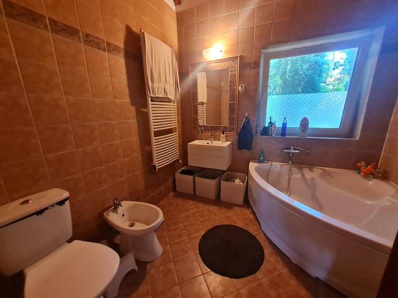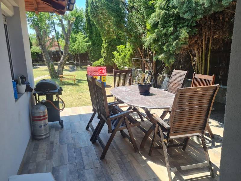 Pomázon gyönyörű környezetben nagy 654 m2-es összközműves sík telken eladó ez a földszintes, 2000-ben épült 4 szobás önálló családi ház.5 m-es belmagasságú, a mennyezet igényes faburkolatú.Az amerikai konyhás nappali terasz és kertkapcsolatos, ebből nyílik a 3 hálószoba és a fürdőszoba. Külön kamra, szép terasz és fedett kocsibeálló, és kerti sütögető tartozik még a házhoz.A nappaliban hűtő-fűtő légkondicionáló berendezés van, a ház fűtése gázkazánnal történik, padló és radiátoros fűtéssel.A gázátalány 20.000 Ft/hó, a ház teljes rezsije kb. 45.000 Ft.Műanyag 3 rétegű nyílászárók lettek beépítve szellőztetővel, 15 cm-es szigetelés van a házon.A konyhabútor igényes, sok elemes, konyhasziget is tartozik hozzá.A ház tehermentes, 1/1 es tulajdonú..A telek nagysága miatt a ház elé igény szerint egy gyönyörű medence építhető.