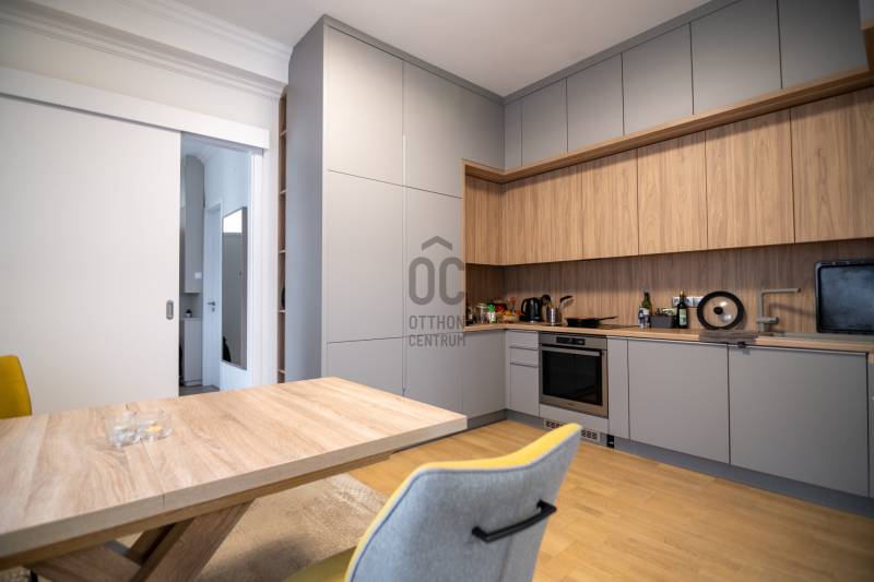 Eladó egy 93 m²-es, 4 szobás, kiváló állapotú, tágas társasházi lakás Lágymányos egyik legjobb részén. A lakás a teljes 5-ik emeleten egyedül helyezkedik el, így rendkívüli privát, csendes, zárt érzetet biztosít – valódi ritkaság a környéken.A ház liftes, a lépcsőház és a közös területek rendezettek, karbantartottak. A fűtés házközponti egyedi méréssel, a lakás délnyugati tájolású, utcai nézettel.Parkolás: a ház alatt található magánteremgarázsban időszakosan bérelhető vagy vásárolható beálló (kb. 30.000 Ft/hó-tól). A környéken ez nagy előny.Helyiségek: tágas nappali (24 m²), három különnyíló szoba, nagy étkezős konyha (16 m²), fürdő + WC, külön WC, gardrób, közlekedők.Nappalija szuper világos, mivel az erkély rész teljesne be lett építve és ott fal helyett végig üveg van. Állapot: lakás – kiváló, homlokzat – jó, lépcsőház – kiváló.Lokáció: Bartók Béla út – galériák, kávézók, BME/ELTE, Móricz és Gellért tér pár perc sétára. Közlekedés kiemelkedő: 4-6, 19, 49-es villamos, gyorsbuszok.Birtokbaadás: max. 4 hónap, de akár hamarabb is lehetséges.Az ingatlan a Hűség értékesítési csomag keretében érhető el, amelynek részleteiről szóban tudunk egyeztetni. Keressen bizalommal, ha megtekintené.Ez az ingatlan a \"Hűség csomag\" megbízási portfólióhoz tartozik. Részletek az Otthon Centrum weboldalán.
