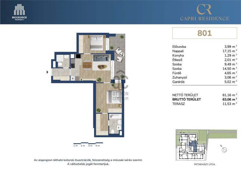 Projekt bemutatásaA Capri Residence a XIII. kerület szívében, a dinamikusan fejlődő Váci út közvetlen közelében valósul meg, amely Budapest egyik legkeresettebb lakáspiaci területe. Az elegáns, modern megjelenésű épületet, a homlokzatán végigfutó üvegkorlátos teraszok díszítik majd, a felsőbb szinteken pedig nagyteraszos lakások is elérhetők, amelyek egy része panorámás kilátást biztosít.Az épületben összesen 112 lakás kap helyet, amelyek elrendezése a stúdiótól a nappali plusz három hálószobásig terjednek. Az épületben emellett egy közösségi tér, 122 parkolóhely, 62 tároló, valamint opcionálisan elektromos autótöltővel szerelt teremgarázs beállók is megépítésre kerülnek.A műszaki felszereltség a legmagasabb szakmai trendeket követi: a Capri Residence lakóinak kényelmét mennyezeti hűtés-fűtés, háromrétegű üvegezéssel ellátott műanyag nyílászárók, smart-home előkészítés, valamint belsőépítész által összeállított belső anyagválaszték biztosítja majd. A földszinti lakásokhoz privát kertkapcsolat tartozik, emellett a társasház közös díszkerttel is rendelkezik.