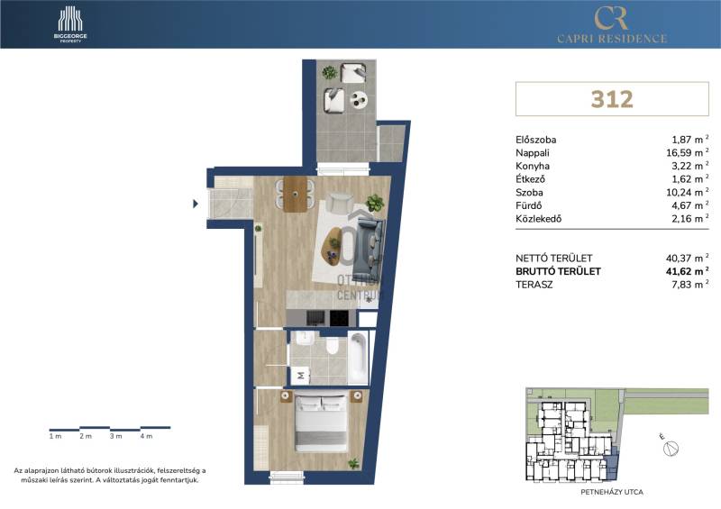Projekt bemutatásaA Capri Residence a XIII. kerület szívében, a dinamikusan fejlődő Váci út közvetlen közelében valósul meg, amely Budapest egyik legkeresettebb lakáspiaci területe. Az elegáns, modern megjelenésű épületet, a homlokzatán végigfutó üvegkorlátos teraszok díszítik majd, a felsőbb szinteken pedig nagyteraszos lakások is elérhetők, amelyek egy része panorámás kilátást biztosít.Az épületben összesen 112 lakás kap helyet, amelyek elrendezése a stúdiótól a nappali plusz három hálószobásig terjednek. Az épületben emellett egy közösségi tér, 122 parkolóhely, 62 tároló, valamint opcionálisan elektromos autótöltővel szerelt teremgarázs beállók is megépítésre kerülnek.A műszaki felszereltség a legmagasabb szakmai trendeket követi: a Capri Residence lakóinak kényelmét mennyezeti hűtés-fűtés, háromrétegű üvegezéssel ellátott műanyag nyílászárók, smart-home előkészítés, valamint belsőépítész által összeállított belső anyagválaszték biztosítja majd. A földszinti lakásokhoz privát kertkapcsolat tartozik, emellett a társasház közös díszkerttel is rendelkezik.