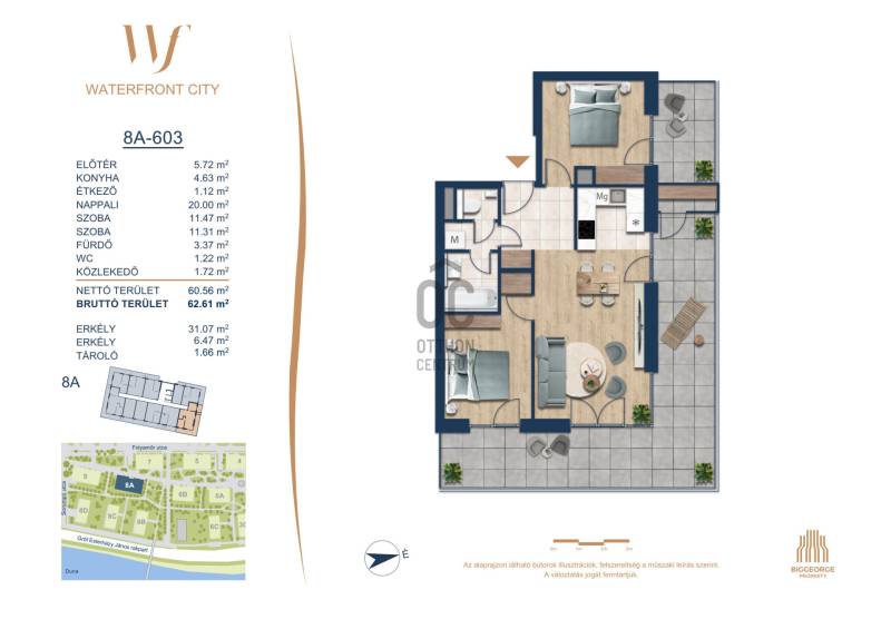 Projekt bemutatásaA projektrőlA Waterfront City egy új, modern városnegyed a 3. kerületben, ahol a természet közelsége és a városi kényelem tökéletes egyensúlyban van. A Duna-part közvetlen szomszédságában elhelyezkedő fejlesztés különleges atmoszférát kínál: a sétányt új épületek határolják, üzletekkel, kávézókkal és szolgáltatásokkal, amelyek élhető közösségi teret teremtenek.A 13 emeletes lakóépületből lenyűgöző örökpanoráma nyílik a budai hegyekre és a folyóra, a tágas teraszok pedig ideálisak a pihenéshez vagy a baráti összejövetelekhez. A zöldtetők, parkosított terek és fenntartható megoldások – mint az energiatakarékos rendszerek és okos otthon funkciók – mind hozzájárulnak a modern, környezettudatos életstílushoz.Látogass el értékesítési irodánkba, és tekintsd meg a városnegyed makettjét személyesen! Ismerd meg, milyen lesz az élet Budapest egyik legizgalmasabb új fejlesztésében!Óbuda szívébenKépzeld el, ahogy egy napsütéses délelőttön Óbuda szívében sétálsz, a Duna közelsége frissítően hat rád, miközben a Folyamőr utca, a Miklós tér és a Bogdáni út által határolt, öt hektáros területre érsz. A levegőben ott van a város történelme, mégis minden részletében a jövő hívogat.A 50 000 négyzetméteres területen egy hangulatos sétány vezet végig, amely egyenesen az óbudai Fő térre visz – mindössze 600 méterre. Ez a sétány nem csupán összeköt, hanem élményt nyújt: a Kolosy térről induló Óbudai Promenád részeként a város egyik legélhetőbb, legpezsgőbb szakaszán haladsz végig. És ha biciklivel érkeznél? A nemzetközi kerékpárút is itt halad el, Szentendre felé vezetve.Az 5. ütemben épülő 149 lakás mindegyike egyedi hangulatot kínál. Ahogy belépsz egy-egy otthonba, a hatalmas üvegfelületeken át beáradó fény és a tágas, szellős terek azonnal magukkal ragadnak. A kilátás? A Kaszap István park zöldje nyújt békét, míg a felsőbb emeletekről a Budai-hegység örökpanorámája tárul eléd – minden nap egy új festmény az ablakodban.A 6. ütemben 316 modern lakás épül, tágas teraszokkal és lenyűgöző kilátással a Dunára és a budai hegyekre. A lakók kényelmét őrszolgálat, kamerarendszer, mélygarázs, vendéglátóhelyek, belső park, játszótér és E-autó töltők szolgálják. Ez a projekt utolsó üteme, amely még közvetlen Duna-parti kapcsolattal rendelkezik.