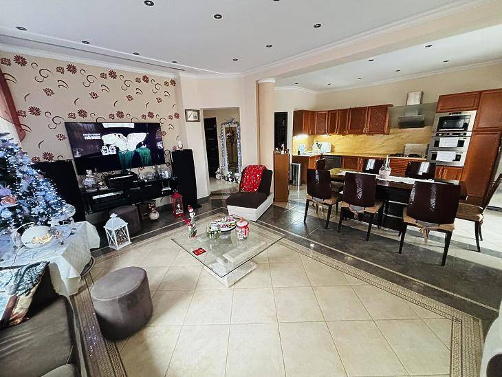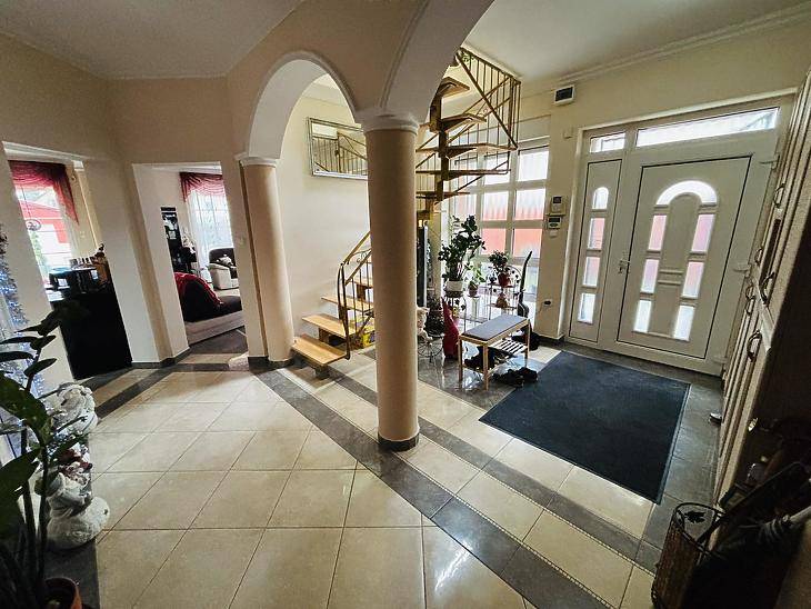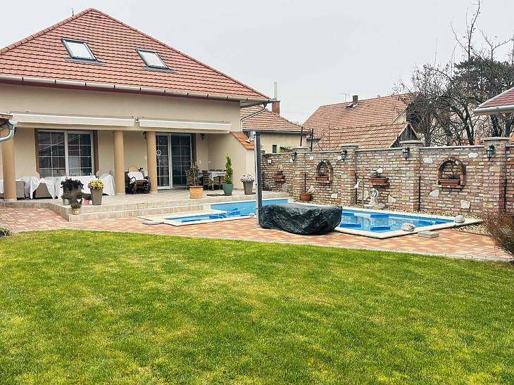 Eladásra kínálunk Fót közkedvelt és könnyen megközelíthető részén egy kivételes adottságokkal rendelkező, 320 m²-es, két szintes luxus családi házat, amelyhez egy igényesen kialakított, 622 m²-es telek tartozik.Az ingatlan 38-as porotherm téglából épült, modern dryvit szigeteléssel, prémium minőségű, hőszigetelt műanyag nyílászárókkal felszerelve, beépített redőnyökkel. A házba lépve egy tágas, 45 m²-es amerikai konyhás nappali fogad, amelyben a falba rejtett házimozi rendszer és leereszthető projektorvászon teremt igazi mozis élményt. A földszinten két kényelmes hálószoba, fürdőszoba, WC, mosókonyha, előszoba és egy fűthető garázs kapott helyet.Az emeleten egy impozáns nappali várja az új tulajdonost – szükség esetén konyha kialakítására is adott a lehetőség –, emellett négy hálószoba, egy újabb fürdő, WC és egy praktikus gardróbhelyiség biztosítja a komfortot.A ház fűtéséről korszerű kondenzációs kazán, padlófűtés és hűtő-fűtő klímák gondoskodnak, minden helyiségben külön szabályozható hőmérséklettel. A belső tereket Versace burkolatok, egyedi gépészet, valamint központi porszívórendszer teszi igazán elegánssá.A parkolás teljes mértékben megoldott: az 50 m²-es, fedett viacolor beállón akár három autó is kényelmesen elfér, a garázs elektromos, 8 méter széles szekcionált kapuval felszerelt, a ház előtt pedig további két parkolóhely áll rendelkezésre. A napelem és hőszivattyú kiépítése előkészítve, a H-tarifa igénylése folyamatban, a puffertartály már beépítésre került.A hátsó kert igazi privát wellness- és pihenőzóna. Az 50 m²-es fedett teraszról egy 7,5 × 3,5 méteres, 1,6 m mély, kiváló felszereltségű fűthető medencéhez jutunk, mely ellenáramoltatóval, automata vegyszeradagolóval, vízlágyítóval, valamint nyak- és hátmasszírozóval is rendelkezik. A gépészetet egy külön, 25 m²-es melléképület rejti, ahol egy szauna is kialakításra került A kertben ezen kívül fedett kerti sütögető is szolgálja a maximális kikapcsolódást.A telek rendezett, vakondhálóval ellátott, gyepszőnyeggel borított, automata öntözőrendszerrel és fúrt kúttal kiegészítve – minden adott a gondtalan kertápoláshoz.Megtekintés miatt kérem, vegye fel a kapcsolatot irodánkkal!