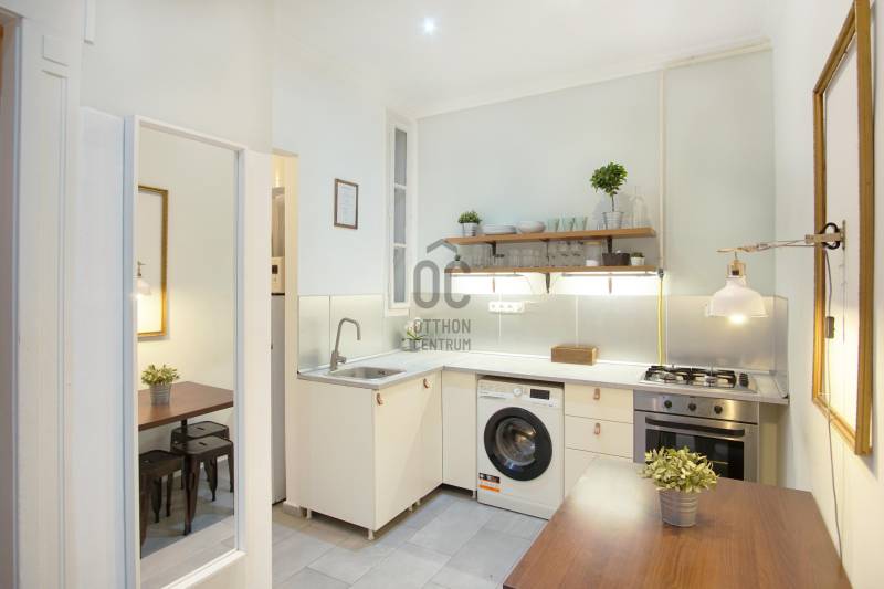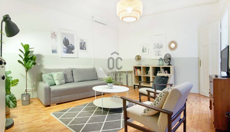 Megvételre kínálom ezt a 2. emeleti, teljesen berendezett, igényesen felújított, belső udvarra néző lakást, amely csendes elhelyezkedésével ideális választás a pezsgő belváros közvetlen közelében. Az ingatlan tényleg kulcsrakész, további ráfordítást nem igényel.A 46 m²-es lakás praktikus, élhető elrendezést kínál:– tágas nappali– külön hálószoba– modern, gépesített konyha– felújított fürdő WC-vel egybenAz ingatlan 8 évvel ezelőtt egy átfogó felújításon esett át, körülbelül 2 éve további korszerűsítések történtek: a fűtésrendszer modernizálást kapott, a fürdőszoba teljes burkolat- és szanitercserén esett át, így friss, igényes megjelenést biztosít a mindennapi használat során. A fűtést MIKA kazán, a hűtést klíma biztosítja.A gondosan karbantartott, kényelmes otthon nyugodt környezetet kínál új tulajdonosának, legyen szó saját használatról vagy befektetési célról. A lakás teljes bútorzattal együtt kerül eladásra, így akár azonnal birtokba vehető, illetve késlekedés nélkül kiadható is, ami különösen vonzó lehet a gyorsan megtérülő befektetést keresők számára.Miért ideális választás fiataloknak?A lakás mérete, elrendezése és a környék fiatalos hangulata miatt tökéletes első otthon lehet. A közelben számtalan kávézó, étterem, edzőterem, bolt és szolgáltatás található, minden gyorsan és könnyedén elérhető – ideális mindazoknak, akik aktív, városi életet szeretnének.És miért kiváló befektetés?A 7. kerület ezen része Budapest egyik legkeresettebb lokációja, folyamatosan stabil bérlői igénnyel.– Hosszú távú kiadásra könnyen kiadható a praktikus elrendezés, a teljes berendezés és a remek közlekedés miatt.– Rövid távú kiadásra pedig a belváros közelsége, a környék pezsgő kulturális és gasztronómiai kínálata, valamint a közlekedési csomópontok közelsége teszi különösen alkalmassá.A környék tömegközlekedési adottságai elsőrangúak: néhány perc séta a metró, a 4-6-os villamos, több busz- és trolivonal is. Emellett a mindennapi élethez szükséges minden szolgáltatás, szórakozási lehetőség és bevásárlási lehetőség szó szerint karnyújtásnyira van.Ha egy olyan lakást keresel, amely azonnal használható, gondozott és értékálló, és Budapest legkeresettebb városrészeinek egyikében helyezkedik el, akkor ezt az ingatlant mindenképp érdemes megnézned.Hívj bizalommal! Ha épp nem tudom felvenni, amint lehet, visszahívlak.Ez az ingatlan a \"Hűség csomag\" megbízási portfólióhoz tartozik. Részletek az Otthon Centrum weboldalán.