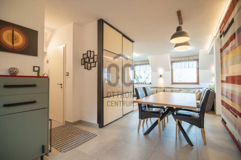 Prémium minőségű, örökpanorámás, 5 szobás lakás Sasadon– zöld környezet, csend, tágas terekHa olyan otthont keres, ahol a valódi nyugalom, a természet közelsége és a minőségi kialakítás együtt van jelen, akkor ez a sashegyi lakás kitűnő választás. Családoknak, pároknak és mindenkinek, aki értékeli a rendezett környezetet és a tágas, világos tereket.Főbb adatok-Alapterület: Bruttó 120 m²-Szobák száma: 5-Belső kétszintes kialakítás-1987-ben épült, 8 lakásos társasház legfelső szintjén-Saját garázs + kocsibeálló + külön tároló-Örökpanoráma a városra és a Sas-hegyreA lakás részleteiAlsó szint:-Tágas, amerikai konyhás nappali étkezővel-Szülői háló privát, dupla zuhanyzós fürdőszobával-Vendégszoba / dolgozószobaFelső szint:-Két különálló hálószoba-Külön fürdőszobaFelújítás és műszaki tartalom – prémium minőség kompromisszumok nélkül- ✓ Teljes körű felújítás 5 éve-Modern kondenzációs kazán, korszerű gépészet-Red Grandis + lucfenyő fa nyílászárók, automata redőnyökkel és szúnyoghálókkal-Padlófűtés + radiátor kombináció-Légkondicionálás-Belső hőszigetelés-Tölgyfa parketta és lépcső-Letisztult, világos enteriőr minden helyiségben, zöldre néző ablakokkalA lakás kivételes hangulatú: minden oldalról fák ölelik körbe, nyáron kevésbé melegszik át, télen pedig kifejezetten harmonikus hőérzetet biztosít.Tartozékok-✓ Saját, zárt garázs (15 m²)-✓ Kocsibeálló-✓ 6 m²-es külön tároló- Gondozott, közös használatú kertLokáció – Sasad, ahol valóban élmény lakniA XI. kerület egyik legkeresettebb része: csendes, zöld utcák, kiváló infrastruktúra, biztonságos környezet.A közelben:-Lauder Javne, Szent Angéla Gimnázium, Bethlen Gábor Ált. Iskola-Bölcsődék, óvodák néhány perc sétára-MOM Park, Hegyvidék Bevásárlóközpont, Tesco, SparJátszóterek, sportpályák, futó- és kerékpárutak-Kiváló közlekedés: 8E, 53, 108E, 139, 153 buszok-M1–M7 autópályák gyors elérésselKinek ideális?-Családoknak, akik hosszú távra keresnek igényesen felújított, fenntartható otthont-Pároknak, akik otthonról dolgoznak és fontos számukra a zavartalan, inspiráló környezet-Befektetőknek, akik értékálló ingatlant keresnek prémium lokációbanEz a lakás nem csak szép – kifejezetten jó energiájú, élhető, világos otthon, amely ritka adottságokkal rendelkezik. Jöjjön el, és nézze meg személyesen: a panorámát és a hangulatot képekben szinte lehetetlen visszaadni.