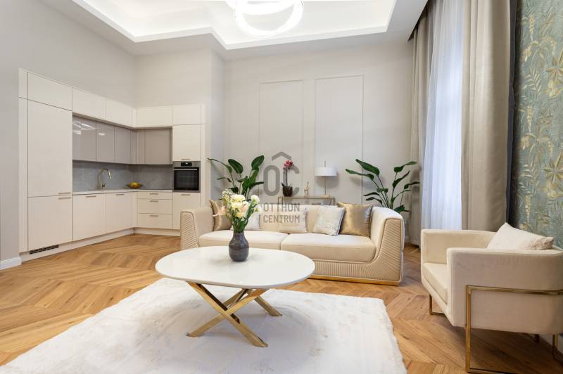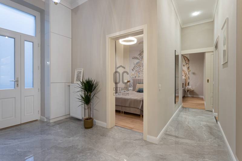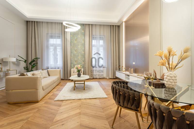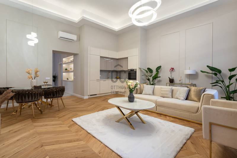 V. kerület Szemere utcában, 86 m2-es nappali + 2 hálószobás +gardrób szobás, duplakomfortos, 3. emeleti, utcai nézetű, luxuslakás eladó. Az ingatlan prémium minőségű felújításon esett át, melynek során a legkiválóbb minőségű anyagokat használták fel, a lakás minden részletében az eleganciát tükrözi.Az ingatlan amerikai konyhás nappalival rendelkezik, mindkét hálószobához külön fürdőszoba tartozik: a fő hálószobához egy elegáns káddal, WC-vel és bidével felszerelt fürdőszoba kapcsolódik, míg a második szobához egy zuhanyzós fürdő. Az ingatlan prémium minőségű bútorokkal és gépekkel együtt eladó, így az új tulajdonos azonnal beköltözhet egy teljesen felszerelt, exkluzív otthonba.A teljes körű felújítás során megtörtént a víz- és villanyvezetékek, valamint a fűtéscsövek, radiátorok cseréje. Designer csillárok, beépített szekrények, minőségi szaniterek és prémium burkolatok kerültek beszerelésre. A 4,3 méteres belmagasság igazán légies, tágas hangulatot ad a lakásnak, a chevron mintás tölgyfa parketta eleganciát és egyediséget. A konyha teljesen gépesített, AEG márkájú készülékekkel felszerelt: mosogatógép, hűtő fagyasztóval, sütő, mikró, főzőlap, páraelszívó és mosógép is rendelkezésre áll. A lakás légkondicionált.A társasház kivül, belül kiváló állapotú, az emeletre jutást 2 modern lift segíti. A lépcsőház függőfolyosós, a lakás a függőfolyosó végén található.A közvetlen közelben több busz- és villamosvonal elérhető, amelyek gyors és kényelmes kapcsolatot biztosítanak a város többi részével. Ez a lakás nem csak otthonként, hanem befektetésként is tökéletes választás azok számára, akik a belvárosi luxust és kényelmet keresik. Az ingatlan minden részlete a legmagasabb színvonalat képviseli, így garantáltan megfelel a legigényesebb vásárlók elvárásainak is.Jöjjön és helyezze magát kényelembe új otthonában!Várom megtisztelő hívását a hét minden napján!