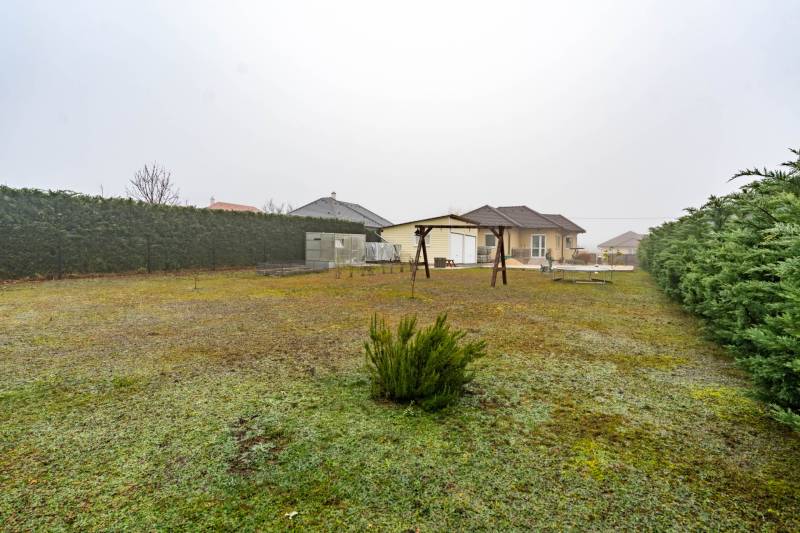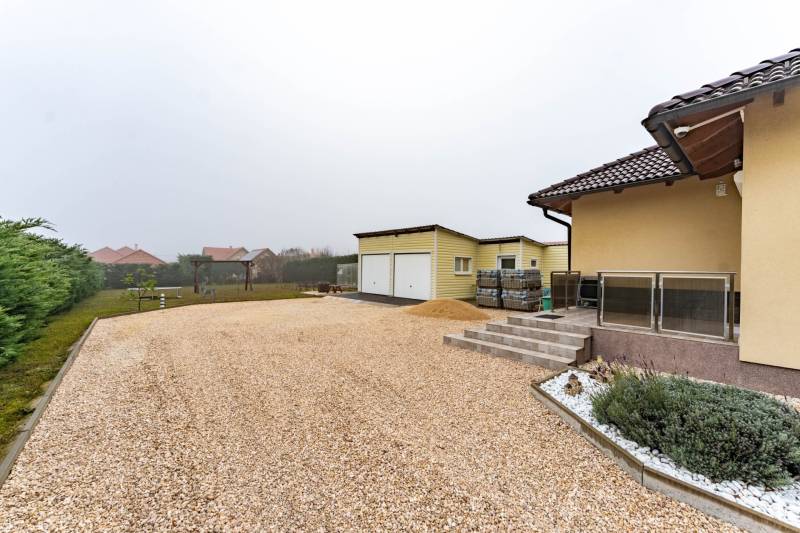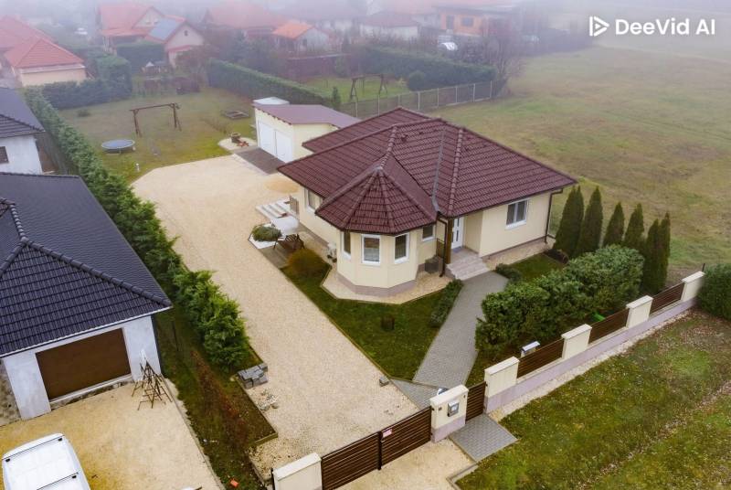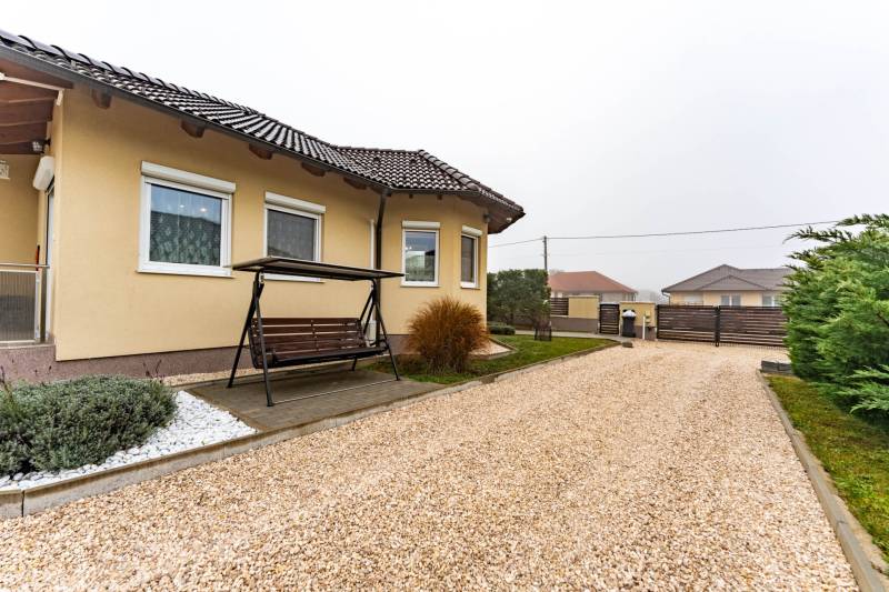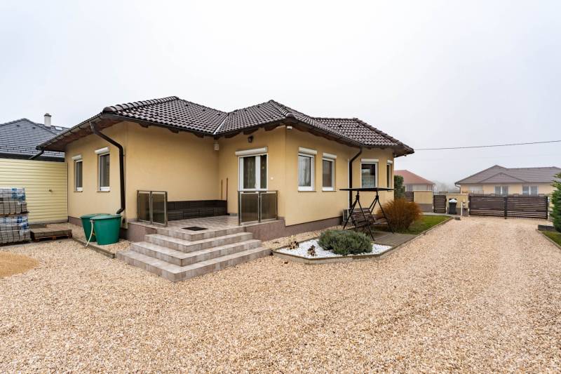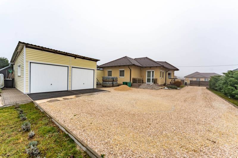Az ingatlanról videót is készítettünk, tekintse meg weboldalunkon, a H511254 regisztrációs számra keresve!A falazat könnyűszerkezetes, készház osztrák technológiával készült, mely számos előnnyel rendelkezik:-kiemelkedő hő- és hangszigetelés, így rendkívül kedvező rezsiköltséggel működtethető,-a külső és belső falakban nagy térfogatsűrűségű (50–60 kg/m³) farostszigetelés található,-rétegrend: 5,5 mm Baumit vakolat + 60 mm vakolható farostszigetelés + 160 mm KVH fa tartóváz + 160 mm cellulóz szigetelés + 15 mm építőlemez + 40 mm belső lécváz + 12,5 mm gipszkarton,-valamint kiváló tűzvédelemmel is rendelkezik.Az ingatlan főbb jellemzői:-3 rétegű műanyag ablakok, redőnnyel és szúnyoghálóval felszerelve,-fűtés gázkazánról működik – a közlekedőben, fürdőszobában, WC-ben padlófűtés, a többi helyiségben radiátoros hőleadás,-helyiségek: 3 hálószoba, nappali, tágas konyha–étkező, WC-kézmosó, fürdőszoba,-a nappaliból közvetlen kijárat nyílik a teraszra,-az udvaron dupla beállásos garázs és egy tágas tároló is megtalálható,-nagy, sík telek – medence, játszótér vagy kerti pihenő könnyedén kialakítható,-kiváló elosztású, praktikus és élhető otthon, ideális választás családosok számára.Elhelyezkedés:Márkó mindössze 5 perc autóútra van Veszprémtől. A településen megtalálható óvoda, étterem, kisboltok, posta, gyógyszertár és orvosi rendelő – minden adott a kényelmes mindennapokhoz.Bővebb információkért és megtekintésért, keressen bizalommal!BANKFÜGGETLEN hitelben és teljes körű ügyintézésben segítünk!