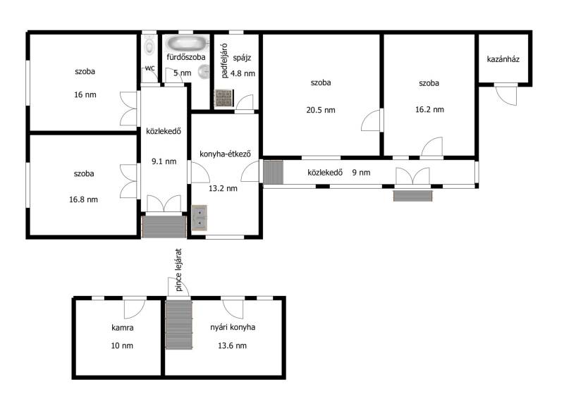 Megvételre kínálok Szabolcsbákán, főutcán egy átlagos állapotú, palával fedett családi házat melynek az első része (66.5 nm) a 80-as éveben B-30-as téglából, míg a hátsó, felújítandó/bontandó (45 nm) traktus vályogból épült, 1176 nm-es 22 méter széles telken. Az ingatlan két utcafronti szobáját keményfa parkettával, a többi helyiséget (az előszobát, a konyha-étkezőt, a külön wc-t, fürdőszobát) járólappal, valamint a hátsó részen található két szobát pvc -vel burkolták. A nyílászárók még az eredetiek, fából készültek, a melegről központi fűtés gondoskodik, ami gáz, illetve vegyes kazánnal is működtethető. Az udvaron egy különálló, teljesen alápincézett nyári konyha valamint kamra-tároló található.Szabolcsbáka eladó családi házAz ingatlanról készült videó megtekinthető: http://youtu.be/-Kig6FCAeco