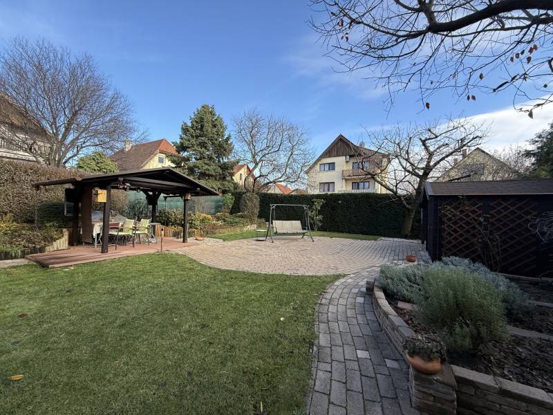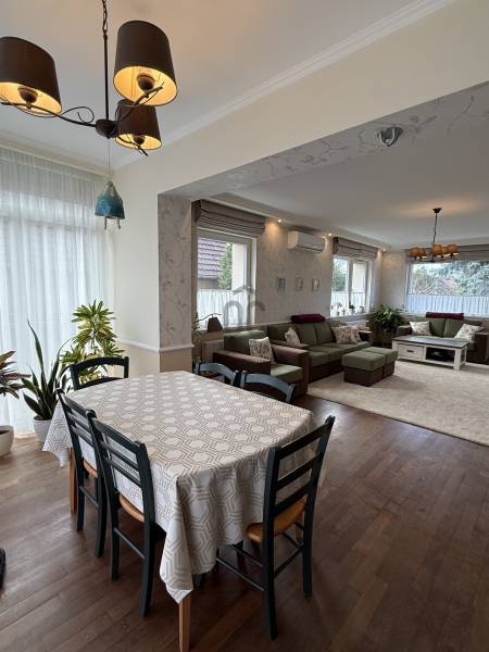 Különleges lehetőség, egy igazán otthonos ház várja Önt Budaörs csendes, kertvárosi részén.Az utcán sétálva nem is gondolná a kedves érdeklődő micsoda kincset rejt a kerítés. Az alsó szintjén található egy közvetlen kertkapcsolatos, nappali és egy hálószobás kialakítású lakás tágas étkezővel, konyhával, fürdőszobával és egy tároló helyiséggel. Külső lépcsőn jutunk fel a felső, belső kétszintes, átgondolt kialakítású, teraszos lakrészbe. Itt egy nagy ablakos étkezőbe érkezünk, a hatalmas nappali mindig fényárban úszik. A konyha a lakás sarkában található, kamrával, kicsit szeparáltan a többi helyiségtől, így mind az amerikai konyha, mind a zárt konyha előnyét élvezheti a tulajdonosa. Ezen a szinten még egy fürdőszoba és egy dolgozószoba található. Belső lépcsőn jutunk fel a felső szintre, ahol 3 hálószoba, egy fürdőszoba lett kialakítva. Erkélyek, teraszok minden szinten kapcsolódnak szobákhoz.Ez a kitűnő állapotú, szuper beosztású, hangulatos, kétgenerációs családiház sok lehetőséget rejt. A házban összesen hét szoba található, így bőséges hely áll rendelkezésre a család minden tagja számára, legyen szó akár gyerekszobákról, dolgozószobáról vagy vendégszobáról. A három fürdőszoba pedig garantálja, hogy a reggeli rohanás során senkinek ne kelljen várakoznia. A gázfűtés és a klímaberendezés biztosítja a megfelelő hőmérsékletet egész évben. A ház kertje varázslatos, intim, praktikus terekkel, szaletlivel, tárolóval, mely tökéletes helyszínt nyújt a szabadidős tevékenységekhez, családi összejövetelekhez. A házhoz elektromos autó töltési lehetőség is tartozik, amely a modern kor igényeit szolgálja ki. Ez a kétgenerációs ház tökéletes választás összeköltözőknek, önállósodóknak, otthon dolgozóknak, vállalkozóknak egyaránt.Méretét tekintve pont jó azt gondolom mindenkinek, nem hatalmas, mégis tágas, a kertje sem óriás, de remekül elfér benne minden (akár egy medence is ), ideális annak, aki Budapesthez közel, zöld övezetben, csendes környezetben képzeli el új otthonát! Budaörs nemcsak a zöld környezetéről, hanem kitűnő közlekedési lehetőségeiről is híres. Az ingatlan könnyen megközelíthető autóval, a közeli főutaknak köszönhetően, de a tömegközlekedés is jól kiépített, így a főváros gyorsan elérhető. A csendes környék biztonságos, ideális helyszín a gyerekek számára, ahol szabadon játszhatnak, felfedezhetik a természetet. A környék számos előnnyel rendelkezik, hiszen a közelben található iskolák, óvodák és bevásárlási lehetőségek is, így mindennapi szükségletei könnyen kielégíthetők. A zöld területek, parkok és játszóterek pedig remek lehetőséget biztosítanak a szabadidő eltöltésére, legyen szó akár sétáról, kerékpározásról vagy piknikezésről.