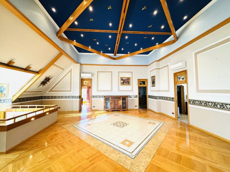 Fedezze fel álmai otthonát Diósdon – háromszintes, hét szobás, nagyvonalú családi ház eladóDiósd egyik legkedveltebb, csendes utcájában eladó egy 479 m²-es, háromszintes, exkluzív családi ház, amelyet térérzet, elegancia és átgondolt funkcionalitás jellemez. Az ingatlan egy 1111 m²-es, parkosított, szobrokkal díszített kertben helyezkedik el, ahol fűthető, római lépcsős medence és 12 m²-es télikert is szolgálja a pihenést.Földszint – a klasszikus elegancia szintjeA házba egy tágas előszobán és közlekedőn át jutunk, ahonnan megérkezünk a 36 m²-es nappaliba, amelyhez közvetlenül kapcsolódik a 12 m²-es télikertA 30 m²-es konyha–étkező–kamra egység családi és baráti összejövetelekhez ideális helyszín.Ezen a szinten található továbbá:37 m²-es hálószoba,12 m²-es gardrób,13 m²-es elegáns fürdőszoba,külön vendégmosdó,36,5 m²-es kétállásos garázs,valamint egy 13 m²-es terasz, amely a kert felé nyílik.Első emelet – a nagyvonalú terek birodalmaA felső szint 4,8 méteres belmagasságával és 73 m²-es nappali–társalgójával igazi különlegesség.Innen nyílnak a hálószobák, mind saját gardróbbal:25 m²-es hálószoba + 22 m²-es gardróbszoba,26 m²-es vendégszoba+ 21 m²-es gardróbszoba. Ezen a szinten található egy 14 m²-es, luxus kialakítású fürdőszoba valamint teraszkapcsolat is. A faburkolatú, üvegkorlátos lépcsőháza ház egyik legszebb, látványos eleme.Kertszint – külön élettér közvetlen kertkapcsolattalAz alsó szint egy önálló, teljes értékű élettér:konyha és étkezőnappali/vendégtér,fürdőszobakazánház és mosókonyhaközvetlen kijárat a gondozott kertbeFelszereltség és technológia- Vaillant gázkazán, padló- és radiátoros fűtés kombinációja-Szintenként szabályozható termosztátok-6 db Panasonic inverteres hűtő-fűtő klíma-Hóolvasztó rendszer a garázsbejárónál-A medencéhez külön fűtőkör-Automata, kútról üzemelő öntözőrendszerA kert – elegancia és nyugalomA parkosított, örökzöldekkel és díszcserjékkel beültetett kert a ház méltó folytatása.A fűthető, római lépcsős medence, a szobrok valamint a télikert együttese páratlan harmóniát teremt.Ez az ingatlan azok számára ideális választás, akik nem csupán házat, hanem életstílust keresnek – ahol a tér, az elegancia és a kifinomult részletek találkoznak.