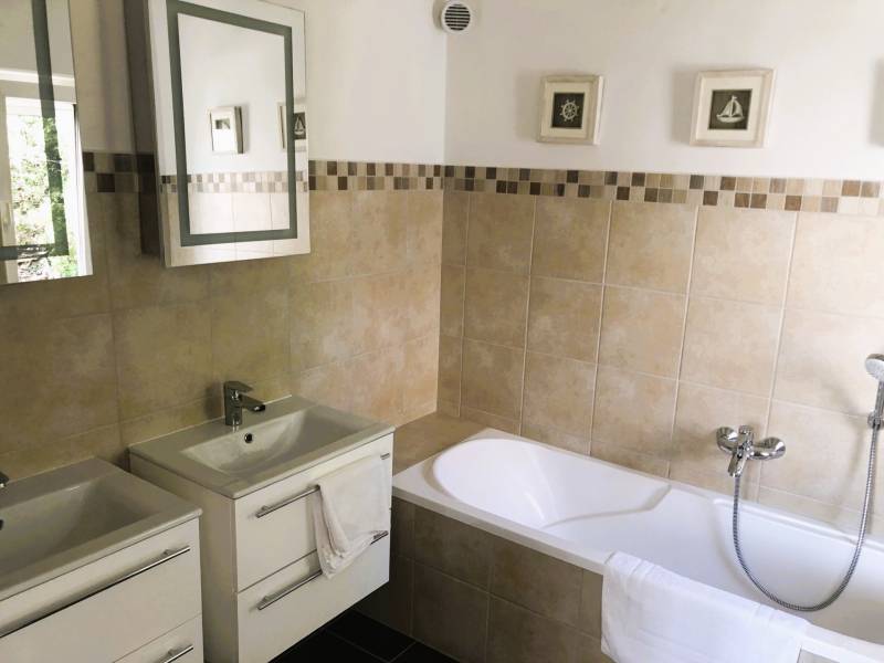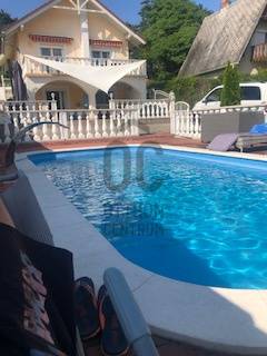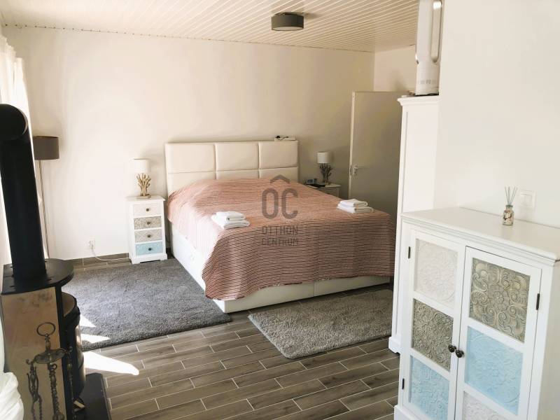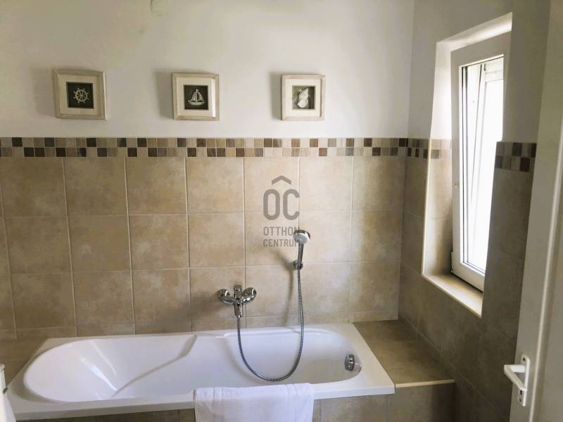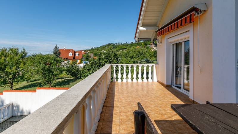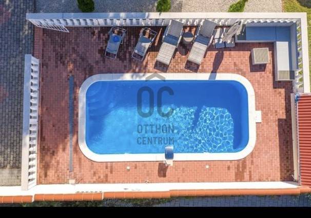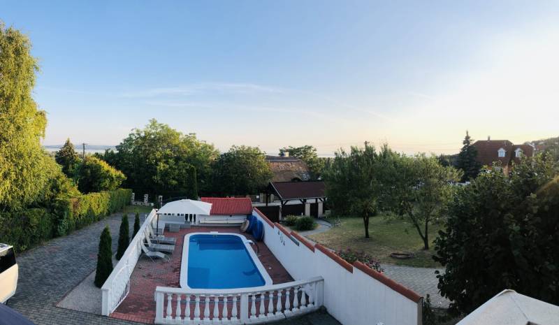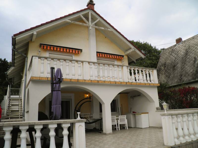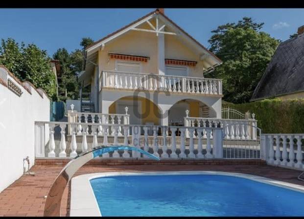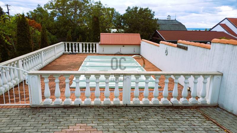A BALATON ÉSZAKI PARTJÁN, VONYARCVASHEGYEN CSENDES KÖRNYÉKEN, NYUGODT KÖRNYEZETBEN ELADÓ PANORÁMÁS, TÖBB FUNKCIÓS CSALÁDI HÁZ ÚSZÓMEDENCÉVEL. AZ OTTHON CENTRUM KIEMELT AJÁNLATA.Az ingatlant biztonságos, kedvelt kicsi zsákutcában találjuk. Pontosan illik rá a település szlogenje: \" Mögöttünk az erdő, előttünk a víz.\" A telek 714 m2, nagyrész térkövezett, könnyen karbantartható. A ház két szintes, hatalmas terasszal, erkéllyel, ahonnan a Balaton tükrében is gyönyörködhetünk. Megbízható minőségben épült 2003-ban, néhány éve modernizálták, alakítottak a használati beosztáson.További jellemzői: - Összközműves tégla épület, cserép fedéssel. Műanyag nyílászárók. - Gáz cirkó fűtés, + két hangulatos kandalló -4 hálószoba, 3 fürdőszoba nagyobb családnak is kényelmes elhelyezést biztosít. - A nettó lakótér 120 m2, ami nem foglalja magában a teraszokat, erkélyt, tárolókat. - Helyiségek: A földszinten teraszkapcsolatos nappali, egy légterű, de szaperált modern konyhával, étkezővel. Kis közlekedőből nyílik egy fürdő, tágas hálószoba és a lépcsőfeljáró. A felső szintre belül, és külső lépcsön is fel lehet jutni. Itt három hálószobát, zuhanyzós és kádas fürdőszobaát alakítottak ki. A déli tájolású legnagyobb hálóból panoráma erkély nyílik. ( Az alaprajzon a megnevezésekben változás történt)A ház mögött két méretes tároló, elektromos távirányítós záróredőnyökkel. Elektromosan vezérelt kapu. Mivel a két szint külön bejárattal is rendelkezik, két generáció lakhatására, nyaralására, kiadásra is alkalmassá tehető. Befektetésnek szintén kiváló ajánlat.A ház teljes berendezéssel. felszereléssel kerül értékesítésre, amit a vételár tartalmaz. Vonyarcvashegyet a Keszthelyi-hegység öleli körül, erdőivel, szőlőültetvényeivel, árnyas pincéivel, benne sajátos ízvilágú boraival. Ötcsillagos Lido strandja számos alkalommal érte el a Balaton legszebb, legsportosabb strandja kitüntető elismerést. A környék jellegzetessége a Csándor-hegy tetején álló Kálvária út és a végén a 2010-ben felszentelt 7,38 méter magas Fénykereszt. A Balatonból kiemelkedő egykori dombsziget, a 136 méter magas Szent Mihály domb. Tetején áll a 40 jéghalász megmenekülése emlékét őrző Szent Mihály Fogadalmi Halászkápolna, mely Magyarország, sőt a tengerparttal nem rendelkező országok egyetlen Halászkápolnája. Ez a csodás fekvésű, romantikus hangulatú szakrális hely megigézi az idelátogatókat. A hosszú évszázadok múltját őrző kápolna Vonyarcvashegy jelképévé vált.Ha felkeltette érdeklődését a fenti ingatlan, további kérdései vannak, megtekintéshez időpontot egyeztetne, kérem, hívjon, írjon a megadott elérhetőségeken.