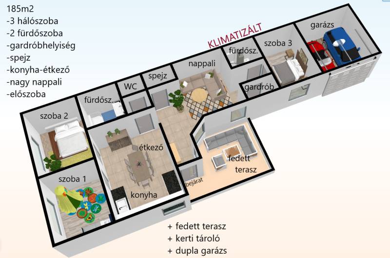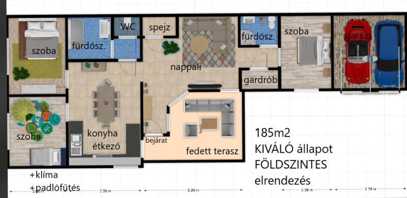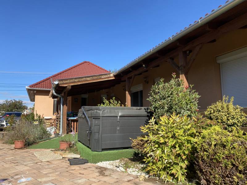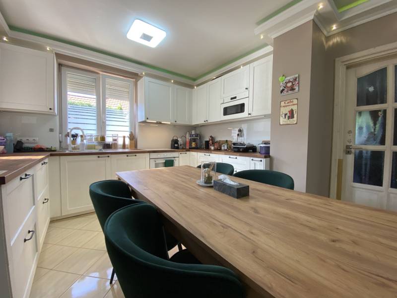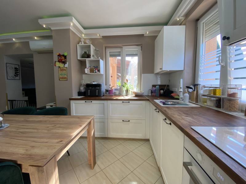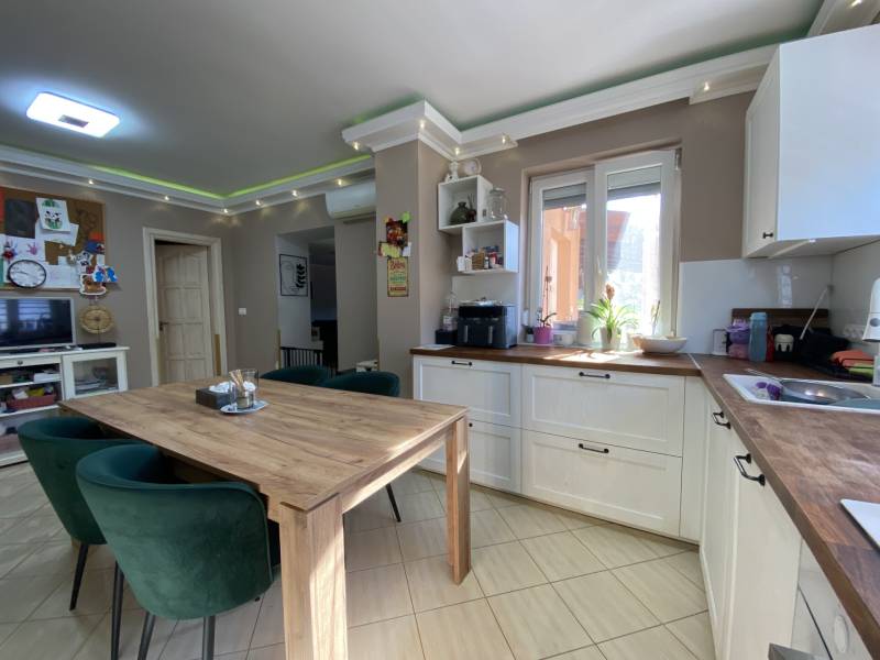 Földszintes álomOtthon GödönGöd a Dunakanyar kapuja, egy festői szépségű bűbájos kertváros a Főváros biztonságot nyújtó közelében.Csodálatos természeti adottságaival, jó nevű iskoláival, pezsgő Duna-parti életével, madárcsicsergős, jó levegőjű hétköznapjaival vált a családalapítók és kiköltözők kedvelt célpontjává.Itt, Felsőgöd szívében került eladósorba egy újjáépített, megkapó hangulatú családi ház.Rendezett, családi házas utcában, tisztes porták szomszédságában, jól ellátott területen kapott helyet.Majd\' 900m2-es kertjét automata kapuval felszerelt míves kovácsoltvas kerítés őrzi, viacoloros autóbeállójáról megközelíthető a 2 autó parkoltatására alkalmas duplagarázs, de a mediterrán térkövön további 3-4 autó parkoltatható kerten belül.A kert gyönyörűen karbantartott, rózsatövek és örökzöld dísznövényekkel ültetett lugasok emelik hangulatát. Kerti tároló gondoskodik a szerszámok elhelyezéséről, gyűrűs kút pedig a kényelmes pázsit gondozásról. Egészséges, beállt thuja sövény, épített játszótér, hatalmas medence, és jakuzzi is szolgálják a Család nyugalmát, ezek mind a vételár részét képezik!A ház 185m2-es, FÖLDSZINTES elrendezésű, Tulajdonosai minőségbeli maximalizmusának méltó tükreként egyedi hangulatvilágú Otthont teremtettek a 2016os teljes átépítés során.3 hálószoba (16m2,18m2,25m2!), 2 fürdőszoba, gardróbhelyiség, hatalmas nappali, spejz, konyha-étkező, és tágas előszoba alkotják a helyiséglistát.A fűtésrendszer megújult, kondenzációs cirkókazán került behelyezésre, a hidegburkolatok alatt padlófűtéssel, hálószobákban radiátoros hőleadókkal.Külső dryvit hőszigetelés, KLÍMA, redőnnyel és szúnyoghálóval is felszerelt műanyagtokos hang és hőszigetelő nyílászárók, rusztikus beltéri ajtók, kamera és riasztórendszer, magasfényű gépesített konyhabútor!Kiváló tájolásának köszönhetően egész nap világos, fedett teraszán az egész család kényelmesen fogyaszthatja a nyáresti vacsorát.Jöjjön el, nézze meg, ha nagy terekre vágyik, ha nem akar felújítani, ha madárcsicsergős bájos utcában tervezi Családja jövőjét egy magas felszereltségű, nagybetűs OTTHON-ban!Vigyázat! -abszolút beleszeretős!Közelben: MINDEN: vasútállomás ( Bp Nyugati PU 30p), városi buszjárat megállója ( Bp.Újpest Városkapu 40p), iskola, óvoda, orvosi rendelő, posta, strand, teniszpark, bicikliút, játszótér, lovarda, bevásárlási lehetőségek, pékség, street gym park.Budapest autópályán 25 perc alatt elérhető, autópálya lehajtó 6perc!