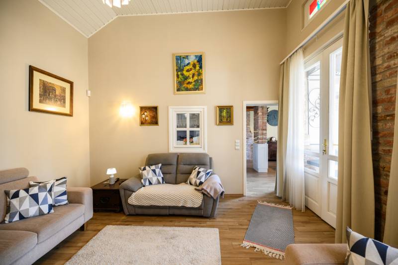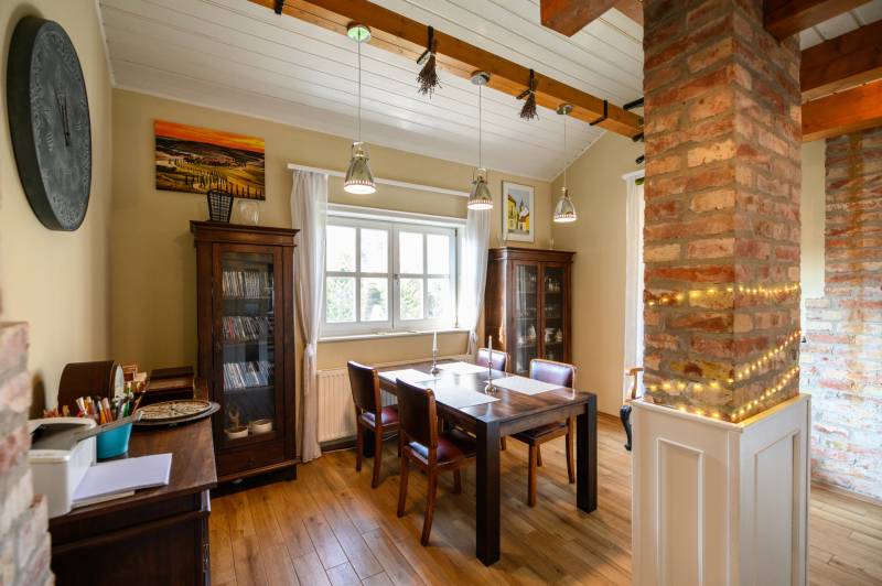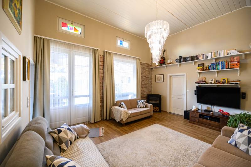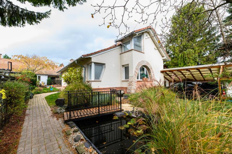 Szentendre egyik legfelkapottabb és legkeresettebb környékén, a csendes Bükkös-patak szomszédságában kínálunk eladásra egy igazán különleges, használt családi házat, illetve egy kisebb házat, amely tökéletes választás lehet családosok számára. A két ingatlan összesen 205 négyzetméteren helyezkedik el, amelyhez egy 563 négyzetméteres rendezett kert tartozik, így bőséges teret biztosít a szabadidős tevékenységekhez és a családi együttlétekhez. Csendes, forgalomtól mentes utcában egy osztatlan közös telken található, amely ügyvédi használati megosztással rendelkezik.A főépületet Turi Attila építész tervezte, aki Makovecz Imre tanítványa volt. Tágas, magas belmagasságú nappalija világos és barátságos légkört teremt, amely ideális helyszín a közös programokhoz. A nappaliba, valamint az emeleti szobákban Aknay János neves festőművész színes ablakai adnak egyedi fényeket. Az épületben központi porszívó rendszer, riasztó és kamerarendszer üzemel.A két házban összesen 7 szoba található, melyek között három fürdőszoba is helyet kapott, így a család minden tagja számára elegendő hely és kényelem biztosított. A modern beépített bútorok és szekrények praktikus megoldásokat kínálnak, míg a 16 négyzetméteres terasz tökéletes helyszín a reggeli kávézáshoz vagy a baráti összejövetelekhez. A kandalló és a gázfűtés, valamint a klíma garantálja az ingatlan kellemes hőmérsékletét télen és nyáron egyaránt. Az épületben központi porszívó rendszer, riasztó és kamerarendszer üzemel. A kisház 120 éves múltra tekint vissza, melyben 1 szoba, gardrób szoba, konyha, fürdőszoba és egy kisebb tetőtéri szoba található. A kellemes hangulatot fokozza a hozzá tartozó régi borospince. A főépület hangulatos terasza, a kerti tároló és a kézműves barkácsműhely, valamint a fedett garázs és a három autó számára beállási lehetőség biztosított, melyet kényelmesen automata garázskapuval érhetünk el.A környék ellátottsága kiváló, így a mindennapi szükségletek könnyedén kielégíthetők. A közeli üzletek, iskolák és óvodák mindössze néhány percnyi távolságra találhatók, ami különösen fontos lehet a családok számára. A csendes utcák és a barátságos szomszédság garantálják a biztonságos és nyugodt életkörülményeket. A közlekedés is kedvező, hiszen a helyi buszjáratok gyorsan elérhetők, így Szentendre belvárosa és a főváros is könnyen megközelíthető. A kertben található jakuzzi és a kerti tároló további lehetőségeket kínál a szabadidő eltöltésére, míg a nagy belmagasságú helyiségek légies érzést kölcsönöznek az otthonának. Ez az ingatlan nem csupán egy ház, hanem egy otthon, ahol a család minden tagja megtalálhatja a maga helyét és kényelmét. Ha Ön is szeretne egy exkluzív, világos és tágas otthont, ahol a családja biztonságban és boldogan élhet, ne habozzon kapcsolatba lépni velünk. Kérdéseivel és érdeklődésével bizalommal fordulhat hozzánk, hiszen célunk, hogy segítsünk Önnek megtalálni álmai otthonát.