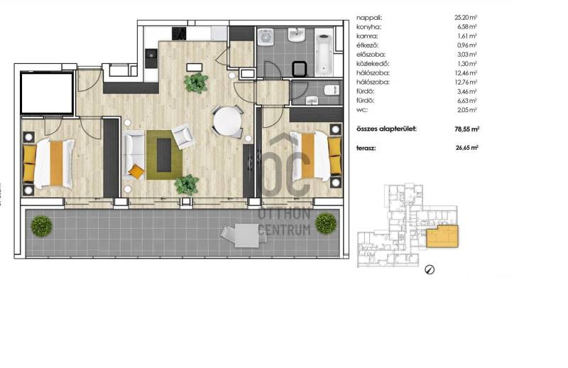 Fedezze fel Budapest 13. kerületének egyik legkeresettebb és legdinamikusabban fejlődő városrészét, Lőportárdűlőt! Ez a frissen átadott, modern lakás ideális választás fiatal felnőttek számára, akik a város szívében szeretnének élni, miközben élvezik a csendes környék nyújtotta előnyöket. Az ingatlan alapterülete 78,55 négyzetméter, amely három tágas szobát, valamint két fürdőszobát kínál, így a családtagok vagy barátok számára is kényelmes életteret biztosít. A lakáshoz tartozik garázs és tároló amelynek ára csomagban 12M forint. A bejárat melletti fürdőszoba az alaprajzon gardróbnak van befejezve de át lehet alakítani második fürdőszobává. A lakás szívét a világos nappali és az amerikai konyha képezi, ahol a közös étkezések és baráti összejövetelek felejthetetlen pillanatai születhetnek. A tágas terasz, melynek mérete 26,65 négyzetméter, csodálatos panorámát nyújt a környező városrészre, így a pihenés és a szórakozás egyaránt megvalósítható a szabadban. A lakás modern fűtési és hűtési rendszere hőszivattyús technológiával működik, amely nemcsak energiatakarékos, hanem kényelmes klímát biztosít az év minden hónapjában. A motoros redőnyök pedig nemcsak a biztonságot növelik, hanem a kényelmet is, hiszen egy gombnyomással szabályozhatja a fényt és a hőmérsékletet. A környék ellátottsága kiváló, hiszen a közelben található boltok, éttermek és kávézók széles választéka várja Önt.A Lehel piac és a WestEnd közelsége miatt a kitűnő közlekedési lehetőségeknek köszönhetően a város bármely része könnyen elérhető, legyen szó akár autós közlekedésről, akár tömegközlekedésről. A környék biztonságos és csendes, ideális helyszín a pihenésre és a mindennapi életre egyaránt. Ez a belvárosi lakás nem csupán egy új otthon, hanem egy lehetőség arra, hogy a város vibráló életét élvezze, miközben a nyugalom szigetén találja magát.Az ingatlan akadálymentesített, így mindenki számára könnyen hozzáférhető, ami különösen fontos lehet a családtagok vagy barátok látogatásakor. Amennyiben felkeltette érdeklődését ez a nagyszerű ingatlan, ne habozzon, keressen bizalommal kérdéseivel! Szívesen állok rendelkezésére, hogy segítséget nyújtsak az ingatlan megtekintésében vagy bármilyen információval kapcsolatban. Az otthonkeresés izgalmas kaland, és én itt vagyok, hogy támogassam Önt ebben a folyamatban!