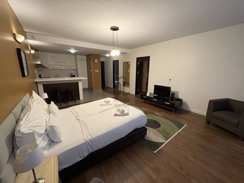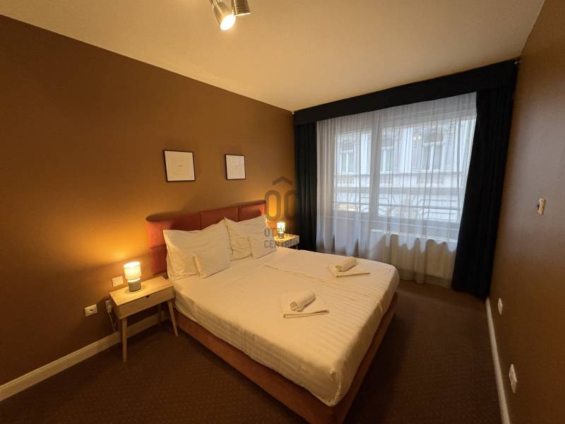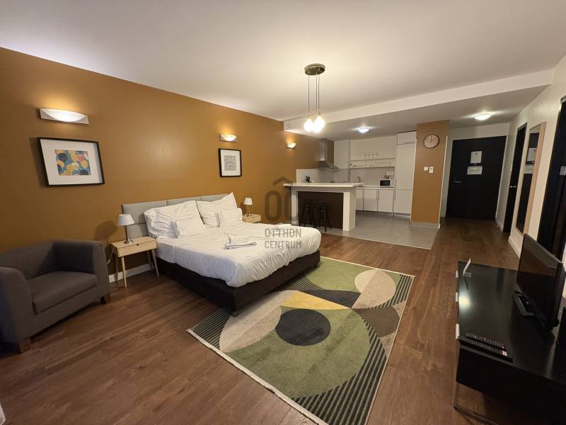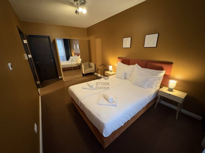 VI. kerület központi részén, pár lépésre az Operaháztól,2011 - ben épült apartman-szállodában, 1. emeleti, csendes utcára néző lakás kiadó.Az épületben 24 órás recepció, uszoda, wellness, fitness terem áll a lakók rendelkezésére.A lakás 63 m2, tágas nappali - konyha - étkezővel, külön hálószobával.A fürdőben kád és zuhanyzó is van.A lakás bútorozott, klimatizált.bérlet 1 éves szerződéstől 700 EUR / hó plusz közös költség és rezsi( van lehetőség rövidebb időre - 3, 6 hónap - is bérelni, magasabb bérleti díjért, ha rövidebb időre bérelné az ingatlant hívjon a részletekért. )kaució: 2 havi díjközös költség: 99e Ft / hó ( tartalmazza a wellness, fitness részleg ingyenes használatát és a 24 órás recepciót )Gépkocsi beálló igény esetén bérelhető az épületben.