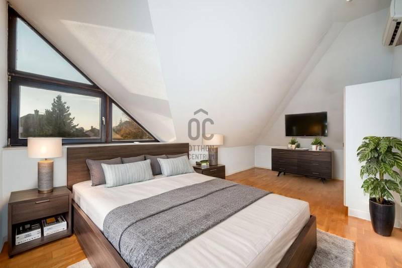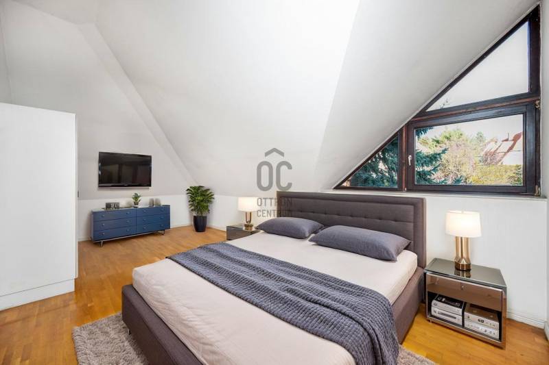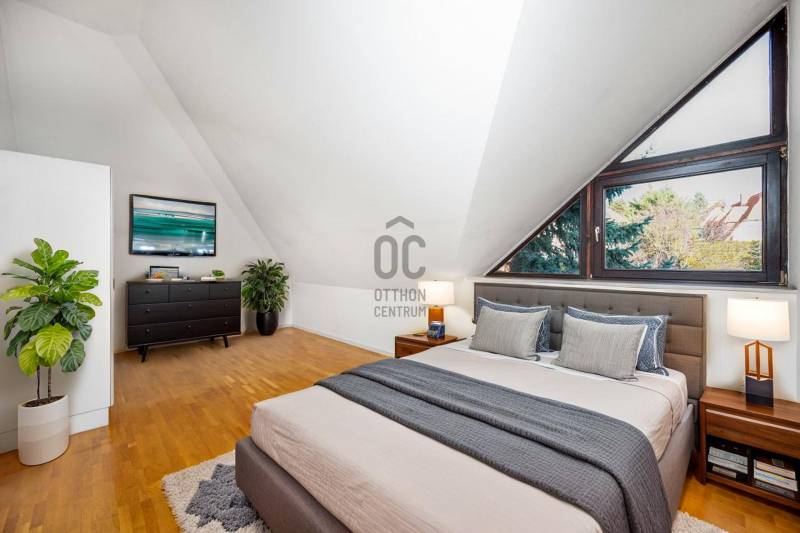 Megvételre kínálunk Pálvölgy egyik legszebb részén egy 210 m2-es, nagyon világos lakást gyönyörű kerttel!A ház 1992-ben épült, a lakás 2000-ben részleges felújításon esett át.Budapest egyik legkedveltebb, zöldövezeti és családbarát részén fekszik, kiváló közlekedéssel és infrastruktúrával.Elrendezés:Tetőtér: 2 hálószoba, TV-szoba, gardrób, fürdőszoba WC-velFöldszint: nappali-étkező, konyha, közlekedő, fürdőszoba WC-vel, gardrob, eloszőba, hálószoba, teraszPinceszint: garázs, mosókonyha, tároló, hobby-szobaNéhány perces sétán belül található több óvoda és iskola (pl. Cseppkő Óvoda, Áldás Utcai Általános Iskola), valamint helyi kisboltok és szolgáltatások.Nagyobb bevásárlási lehetőségek (SPAR, Lidl, Stop Shop, GOBUDA Mall) autóval 5–10 perc alatt elérhetők.A tömegközlekedés megbízható: több buszjárat (11, 29, 65, 111) könnyen elérhető, és gyors kapcsolatot biztosít a belváros vagy a H5-ös HÉV felé.A környék csendes, biztonságos, kiválóan alkalmas családoknak, akik a természet közelségét, mégis a városi kényelem előnyeit keresik.Bővebb információért, megtekintési időpontért vegye fel velem a kapcsolatot.Hívását a hét bármely napján örömmel fogadom!